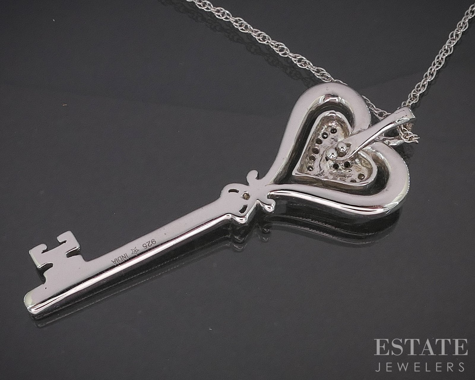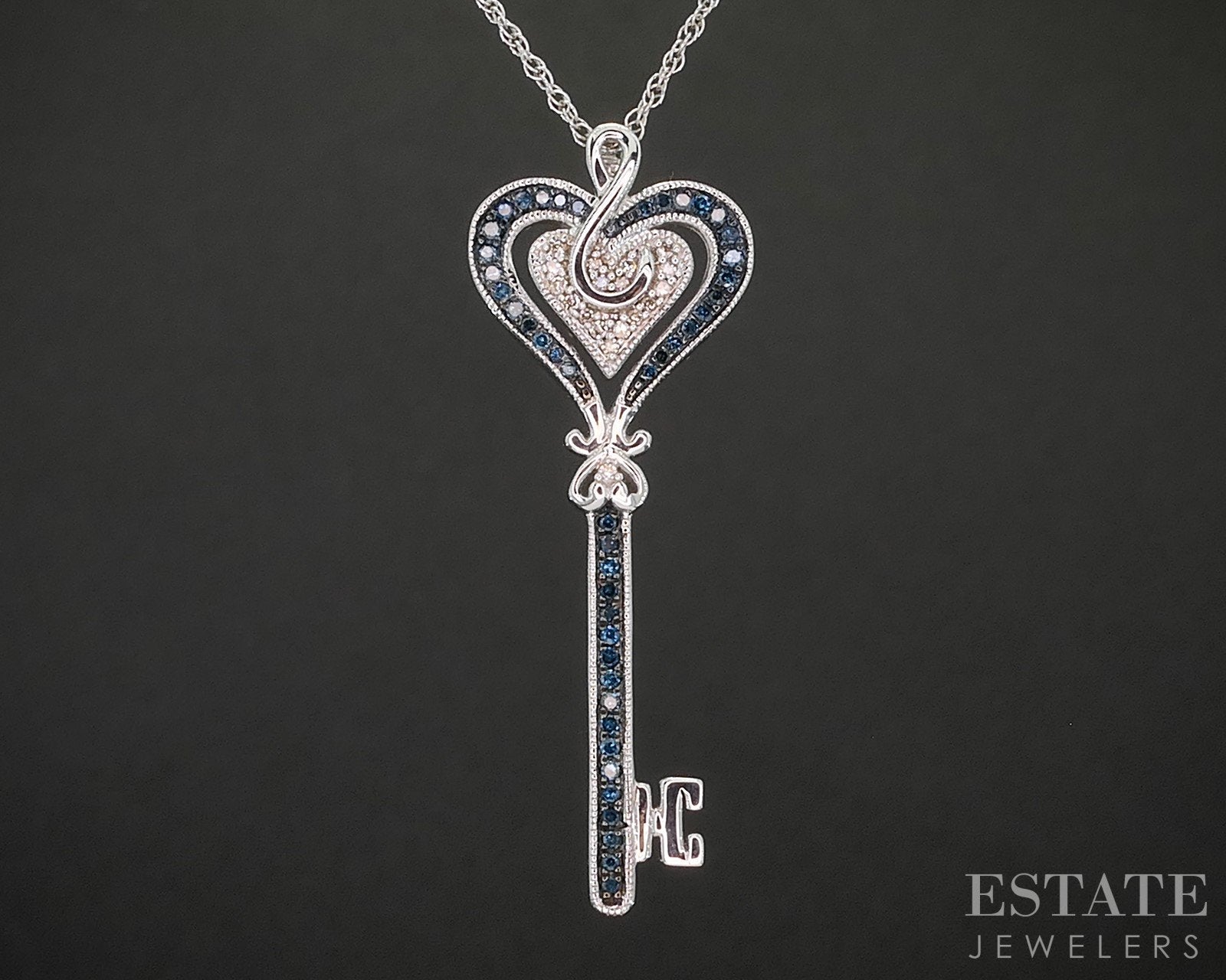 Sterling Silver Natural Blue & White Diamond Heart Key Necklace 7.5g 18"L p19117