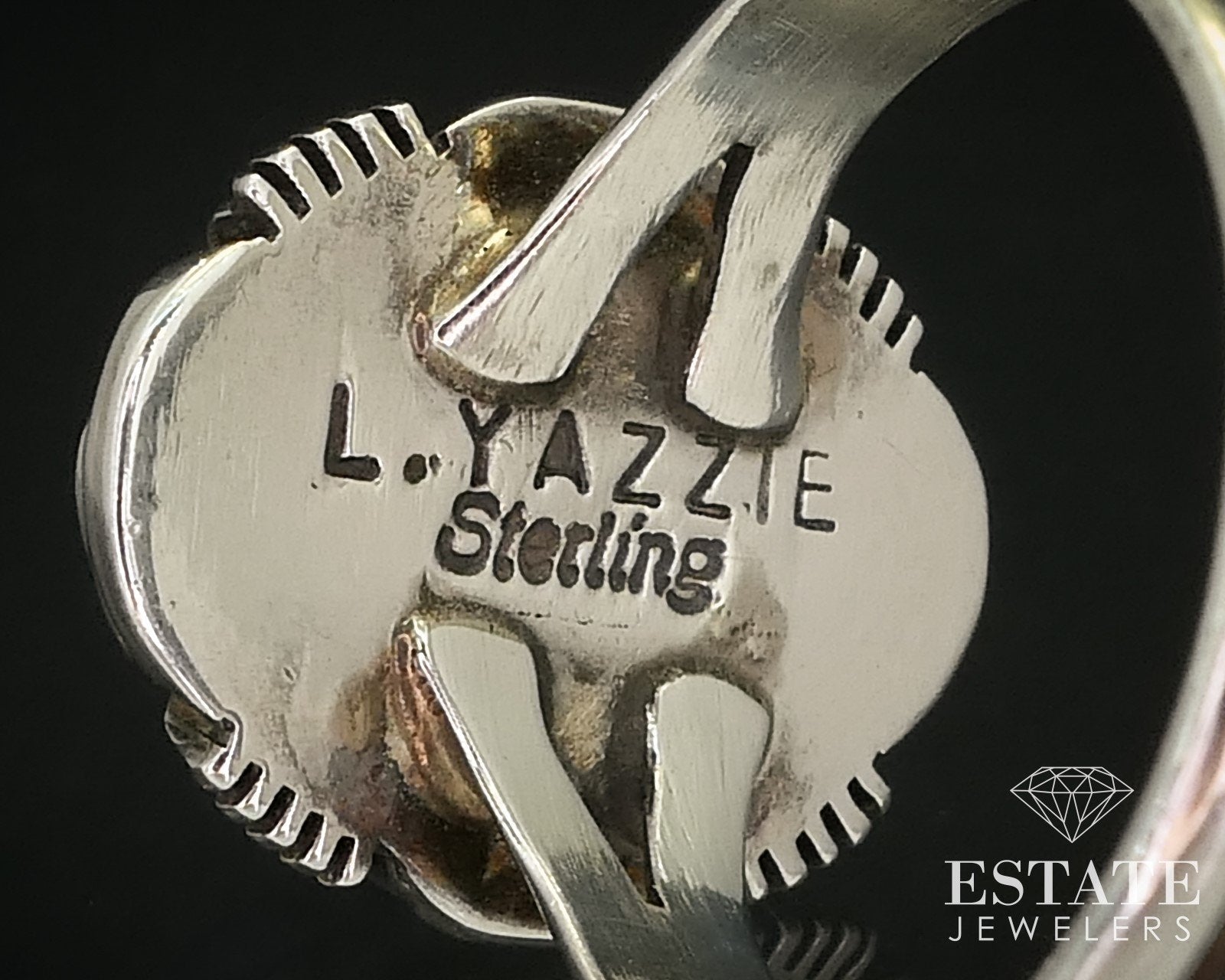 Gorgeous native american sterling silver ladies ring with a bezel set Charoite. 17mm tall face. Stamped L. Yazzie Sterling SIZE-6.5