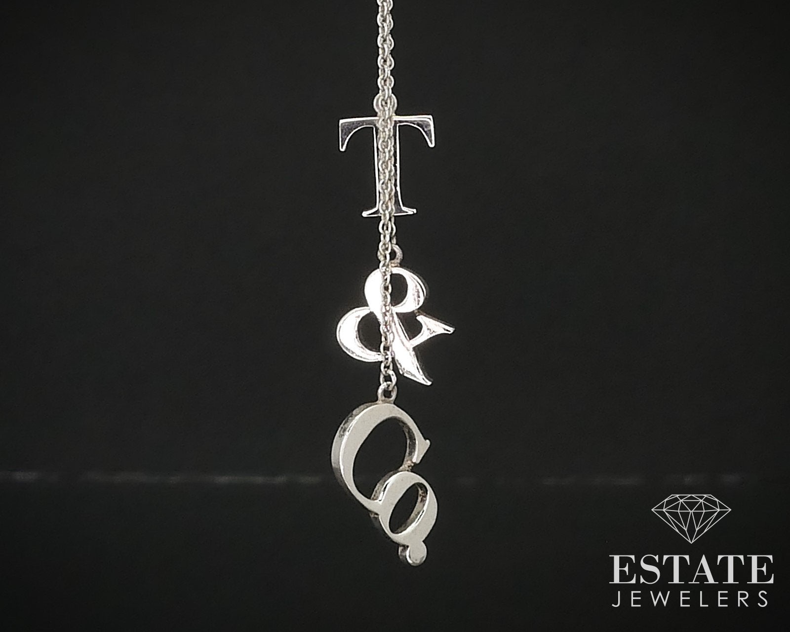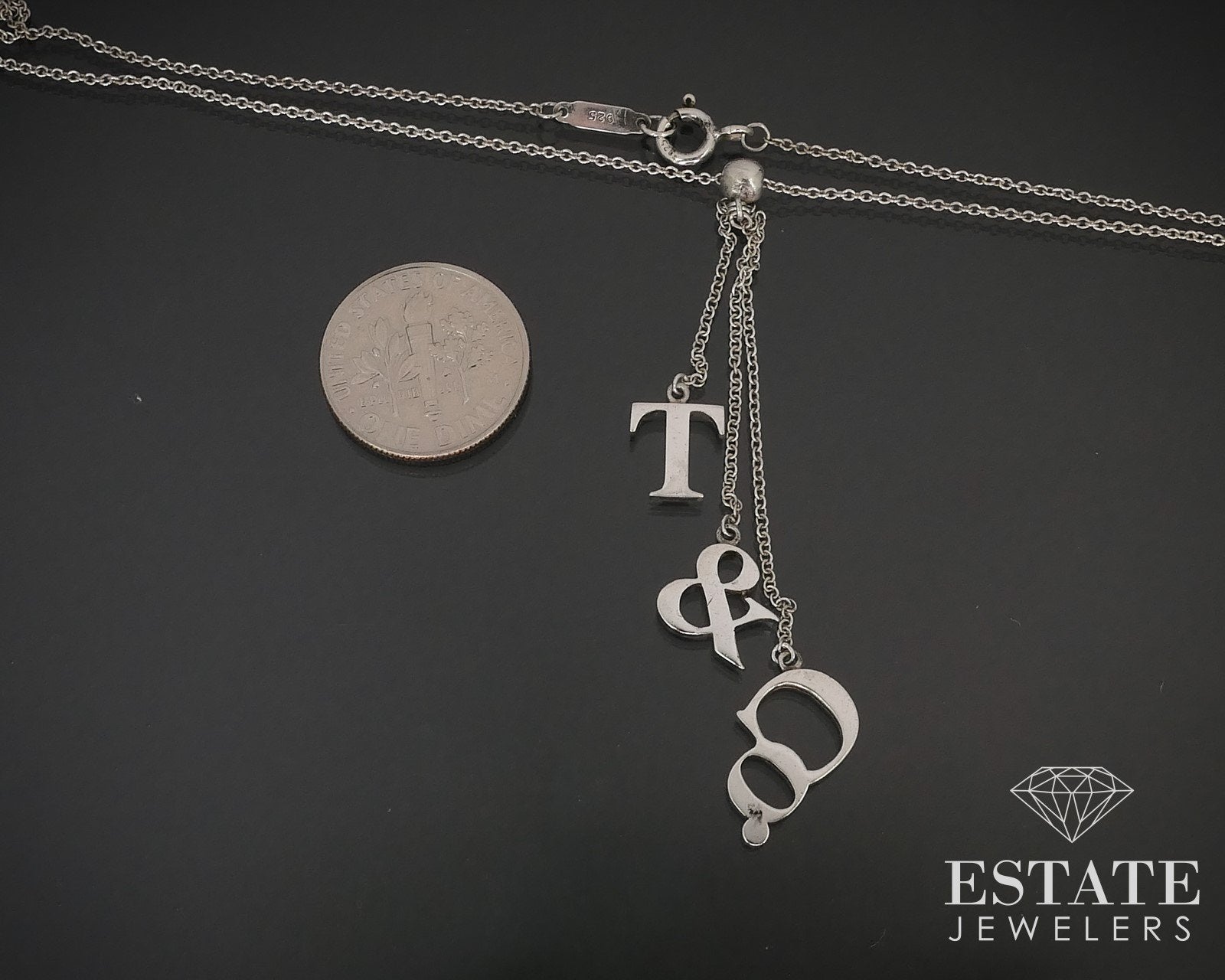 Genuine Tiffany necklace with dangling strands of the letters T & Co.. 16"L chain. 2.5"L drop. Stamped 925 Tiffany