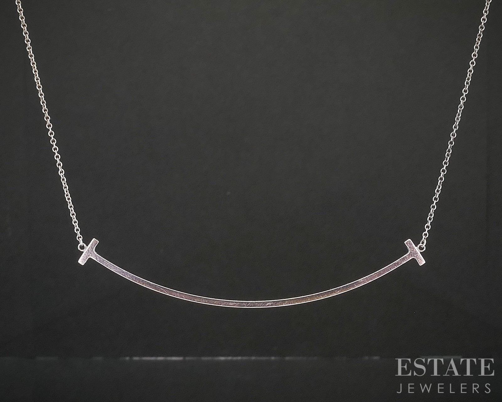 Additional Info : Collectible Tiffany necklace with a smile shaped "T" pendant attached to original Tiffany cable chain! Comes with the original Tiffany pouch.