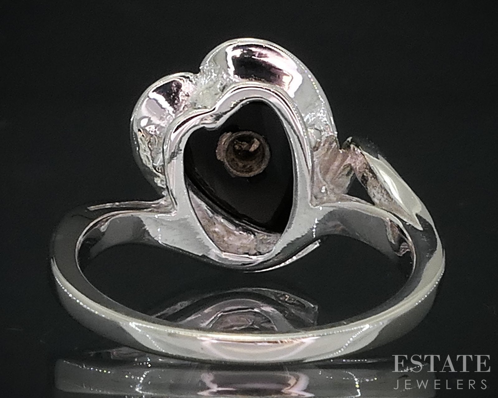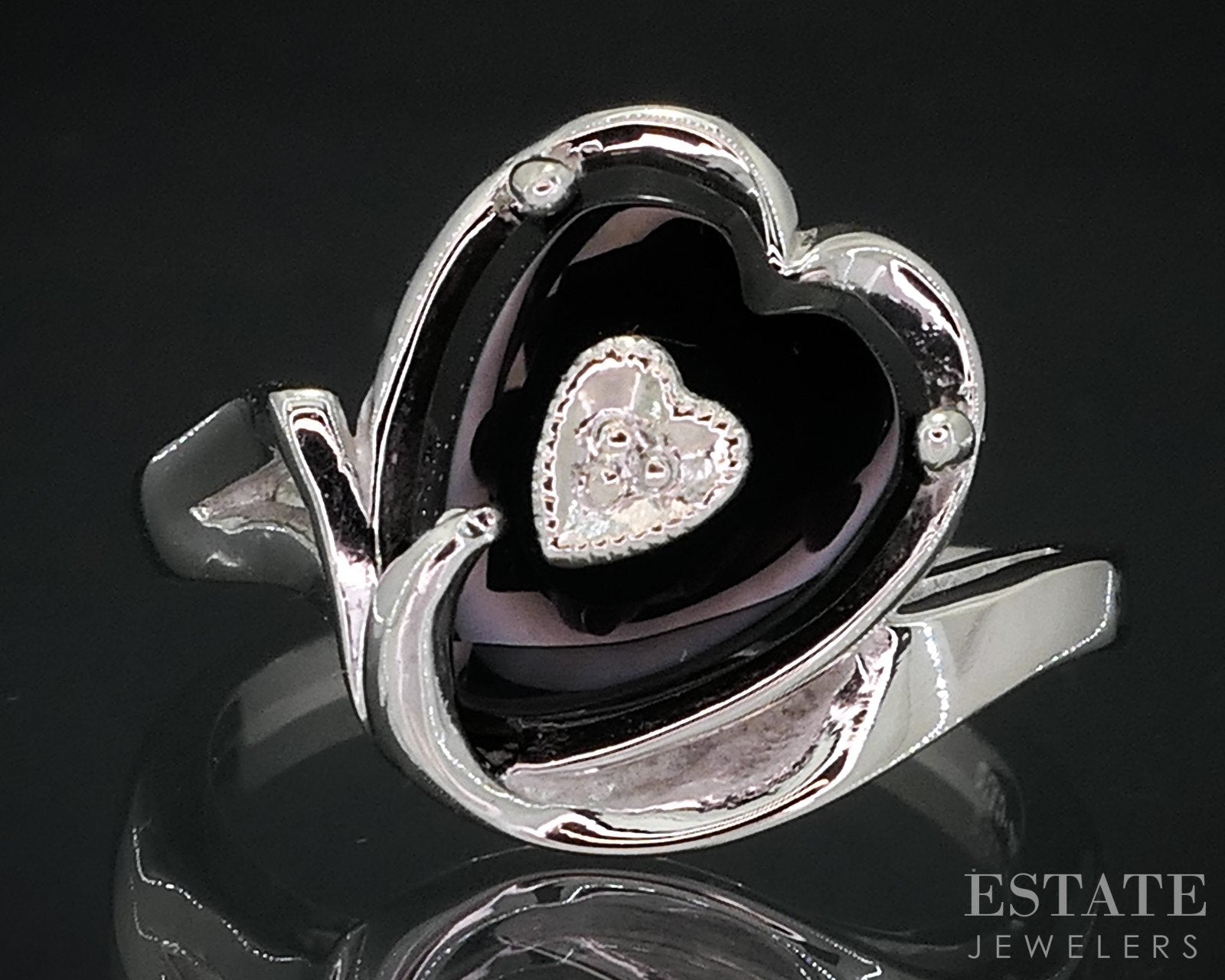 Vintage 10k White Gold Heart Natural Black Onyx & Diamond Ring 3.6g i18607b