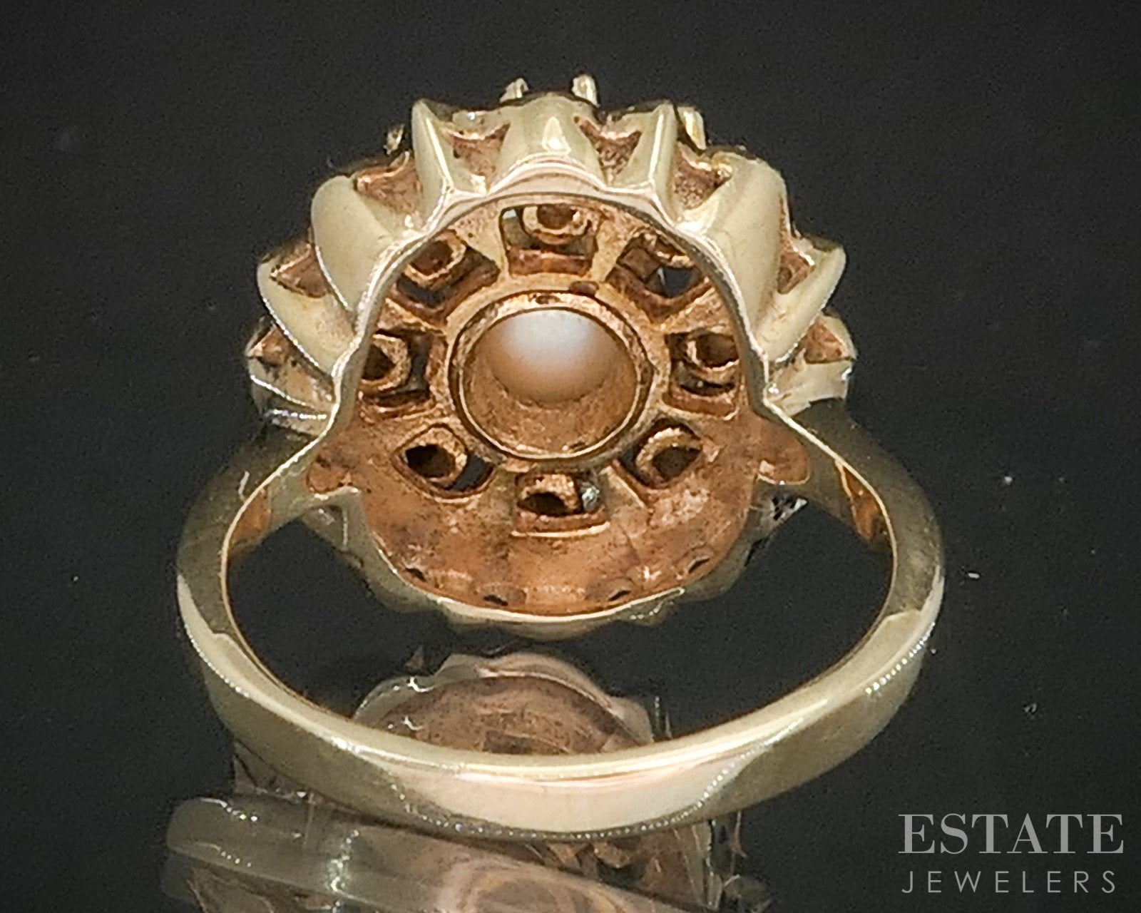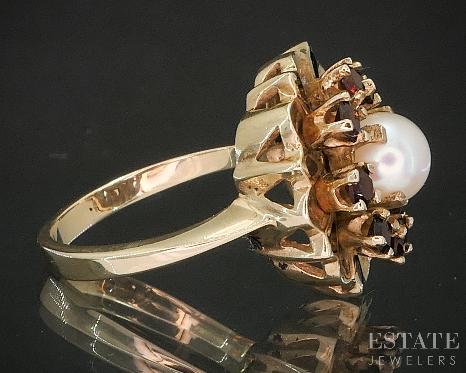 Additional Info: Elegant and steeped in timeless charm, this vintage ring showcases the natural beauty of an Akoya Pearl surrounded by vivid Garnets. Beautiful mid-century flower shaped setting.