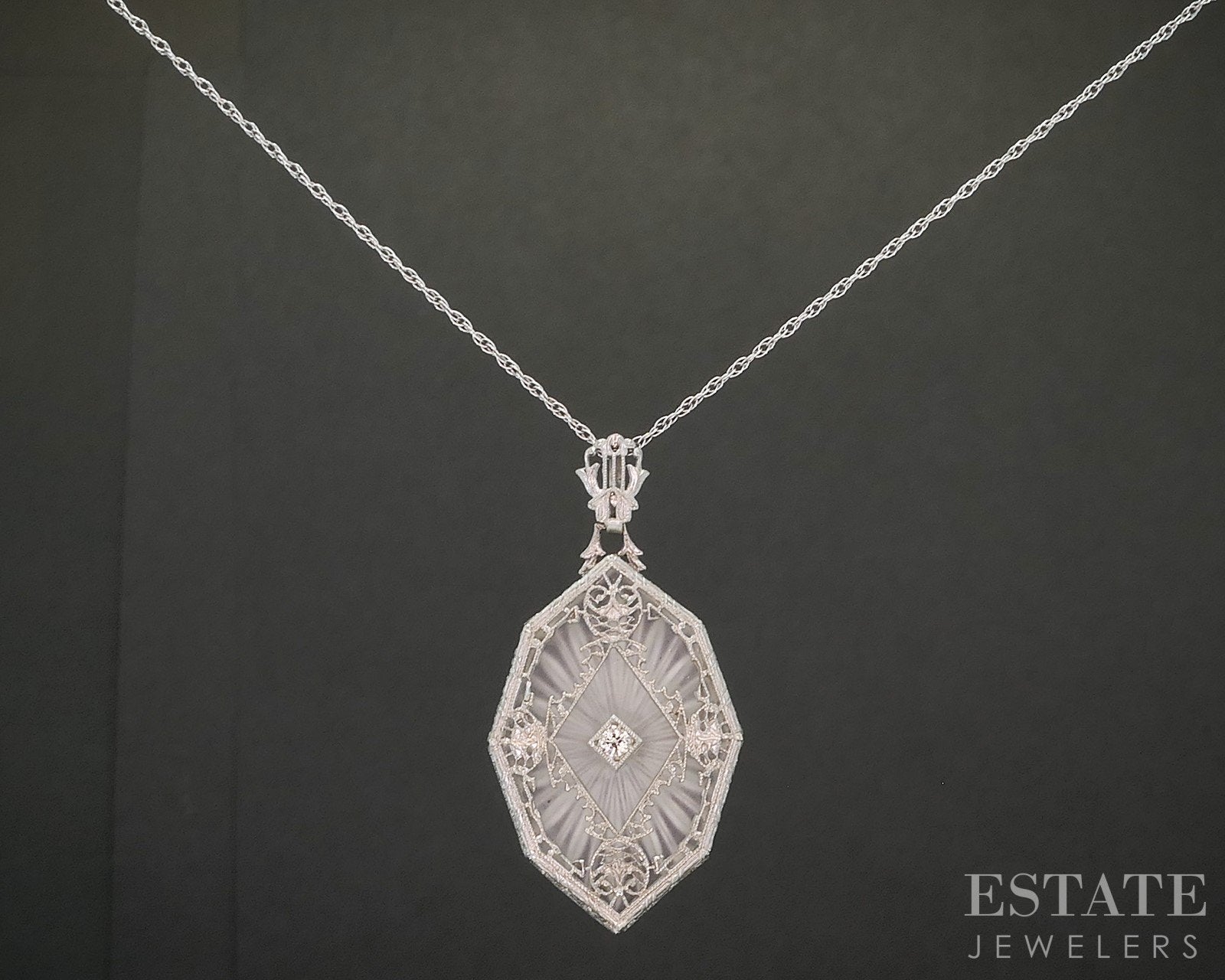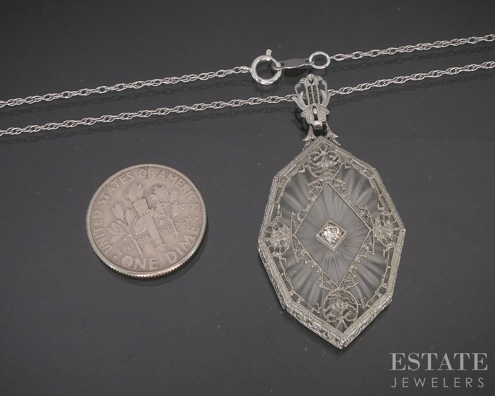 Vintage 14k White Gold Natural Diamond Camphor Glass Filigree Necklace 5g p57240