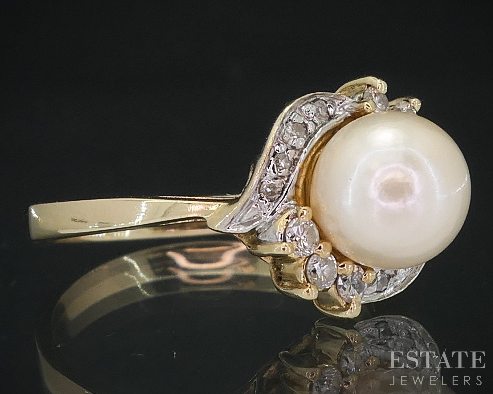 Vintage 14k Yellow Gold 8mm Cultured Pearl & Diamond Ladies Ring 3.7g i18519b
