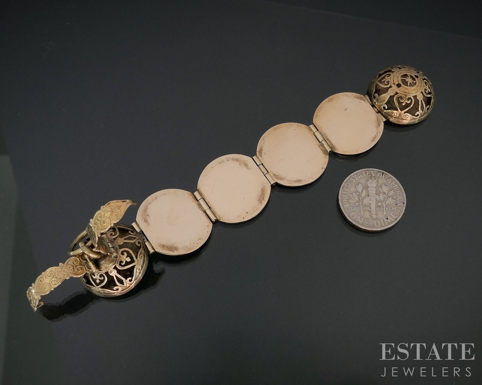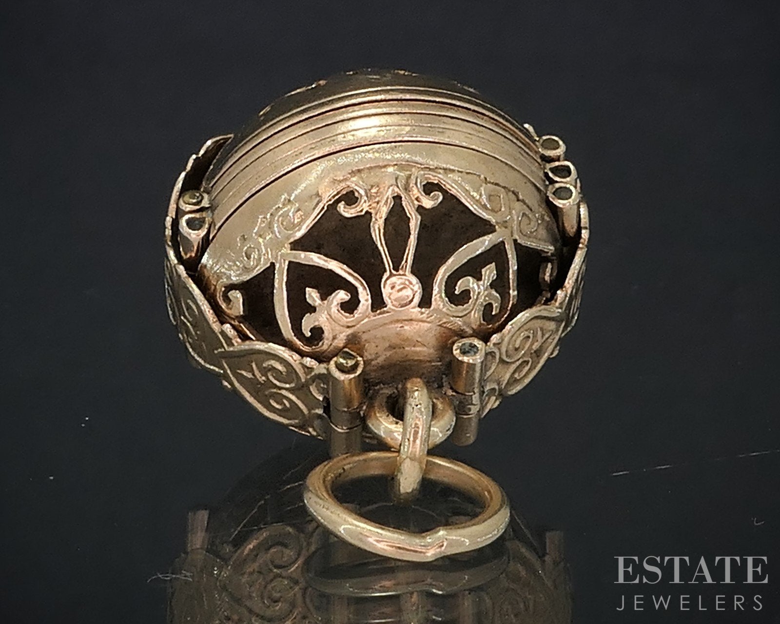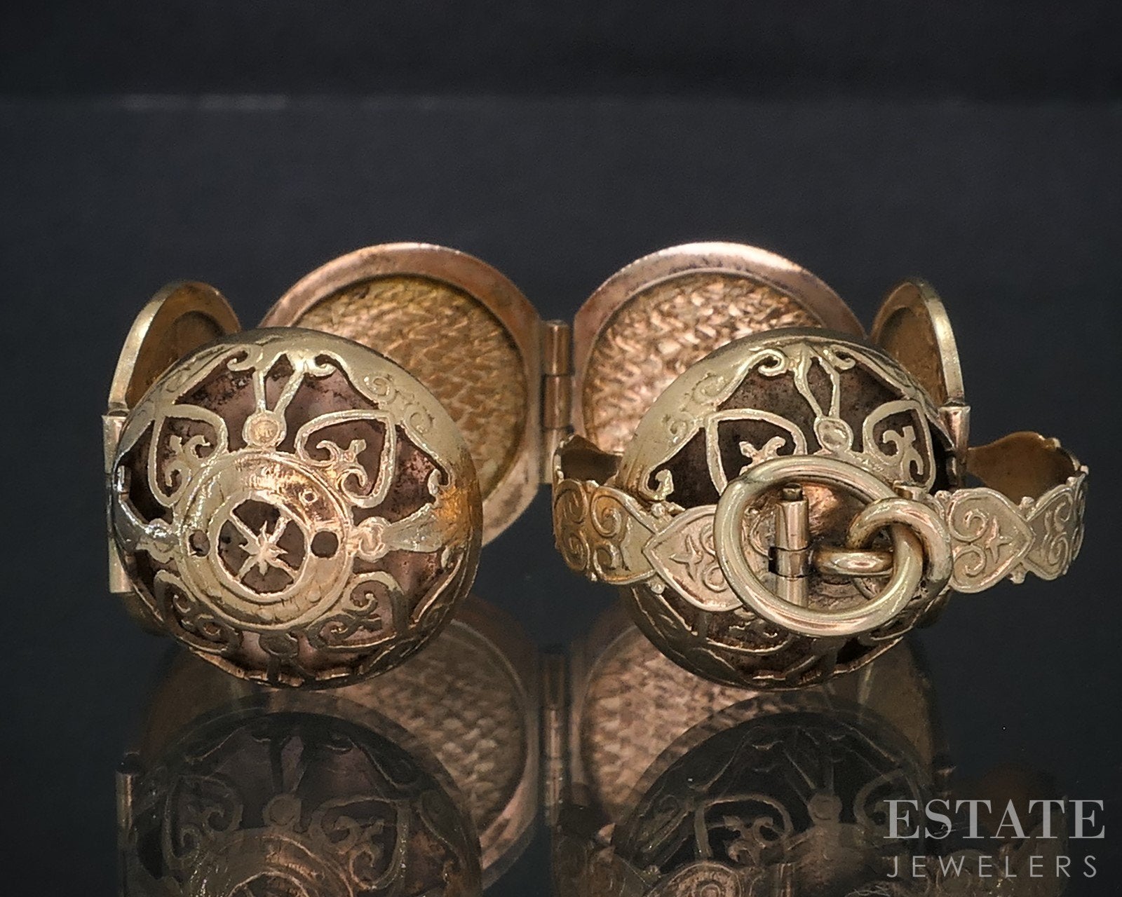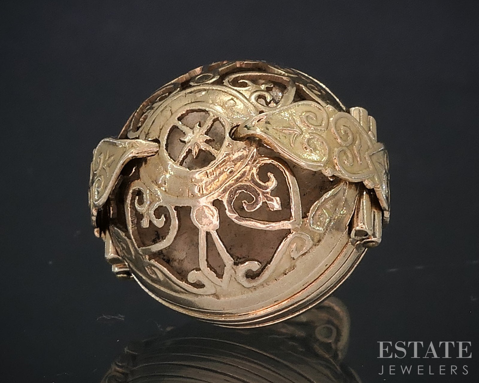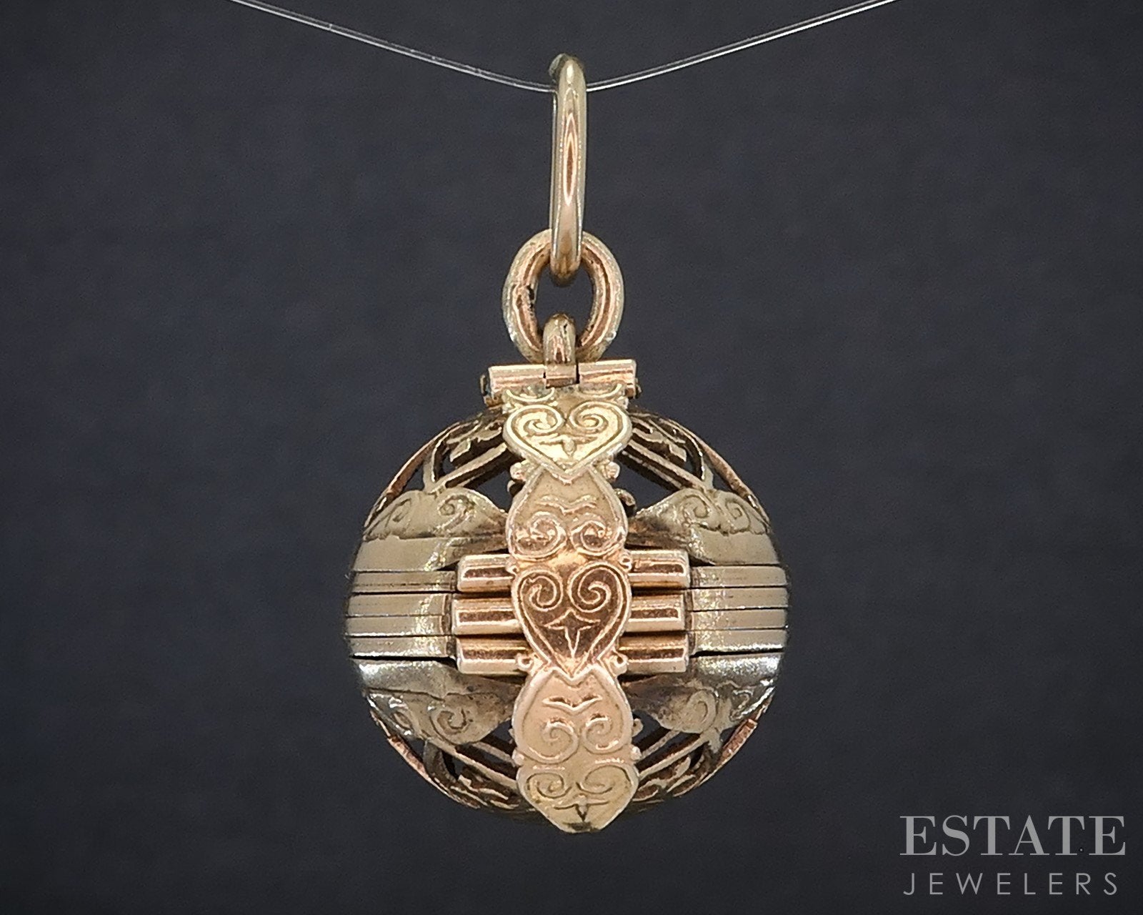 Additional Info: Timeless ladies folding sphere locket with filigree and open revival designs surrounding the globe. This Mid-Century locket is a cherished keepsake crafted in rich yellow gold. Intricately detailed with period-inspired filigree and delicate accents, the piece captures the elegance of a bygone era. The locket opens to reveal multiple spots for your own pictures. Whether worn as a sentimental heirloom or a statement of antique style, this piece brings history to life with every graceful detail