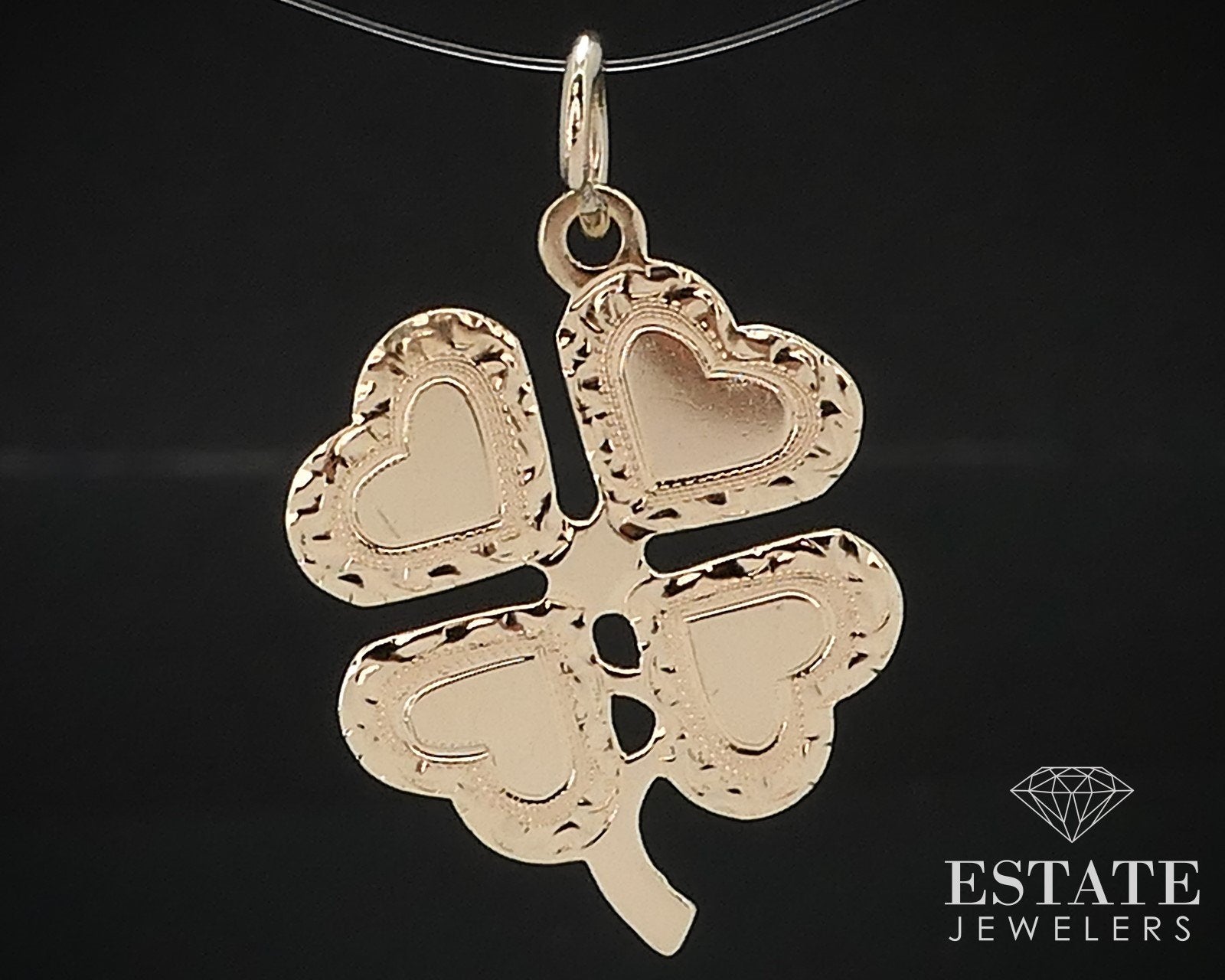Beautiful charm in the shape of a 4 leaf clover made up for hearts. Measures 1" long including bale. stamped 14k.