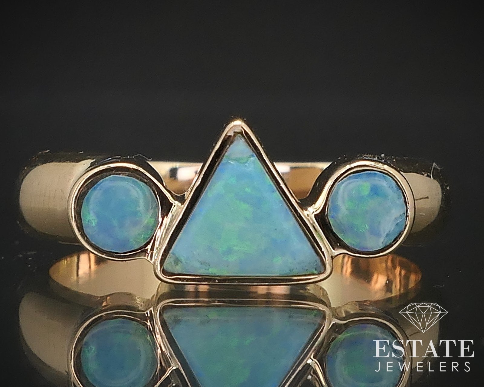 Stunning mid century ring with vivid 5mm and two 3mm blue opals set on the face. Super unique with incredible color flashes! stamped 14k SIZE-6