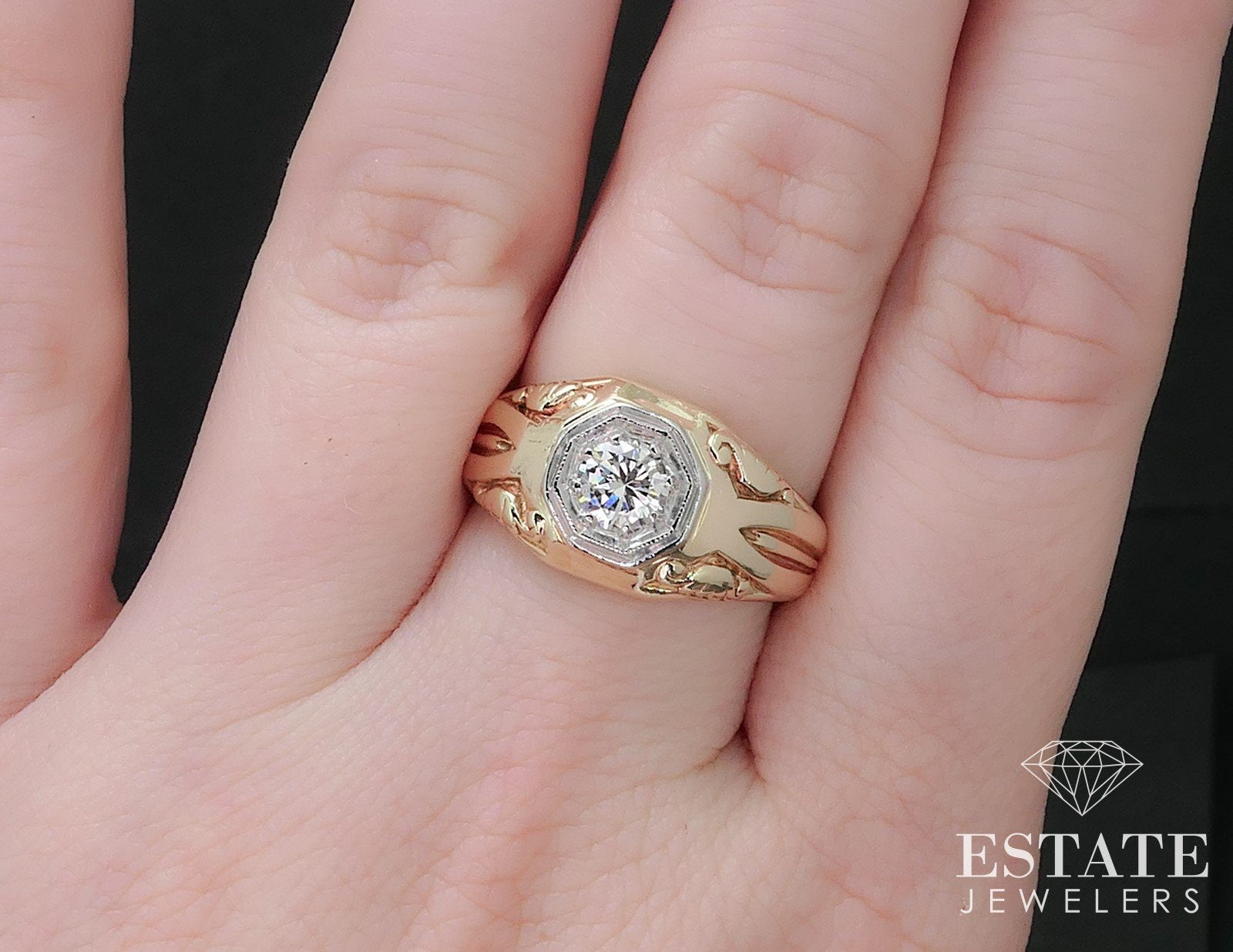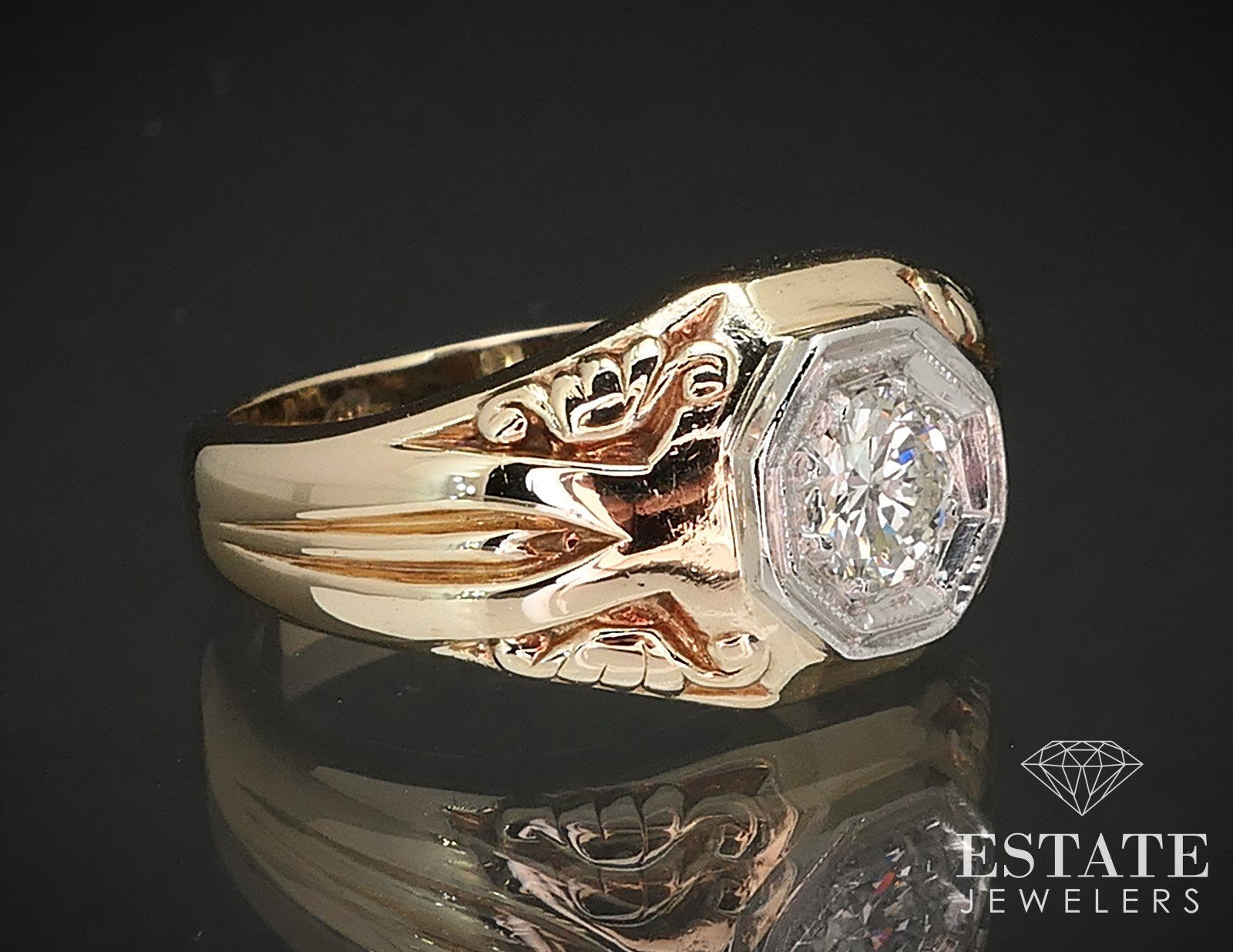 Stunning mid century unisex band ring with a sparkling round cut diamond. Approximate .46ct stone. VS2 clarity with I color. Lovely deep detailing along the setting. Stamped 14k SIZE-7