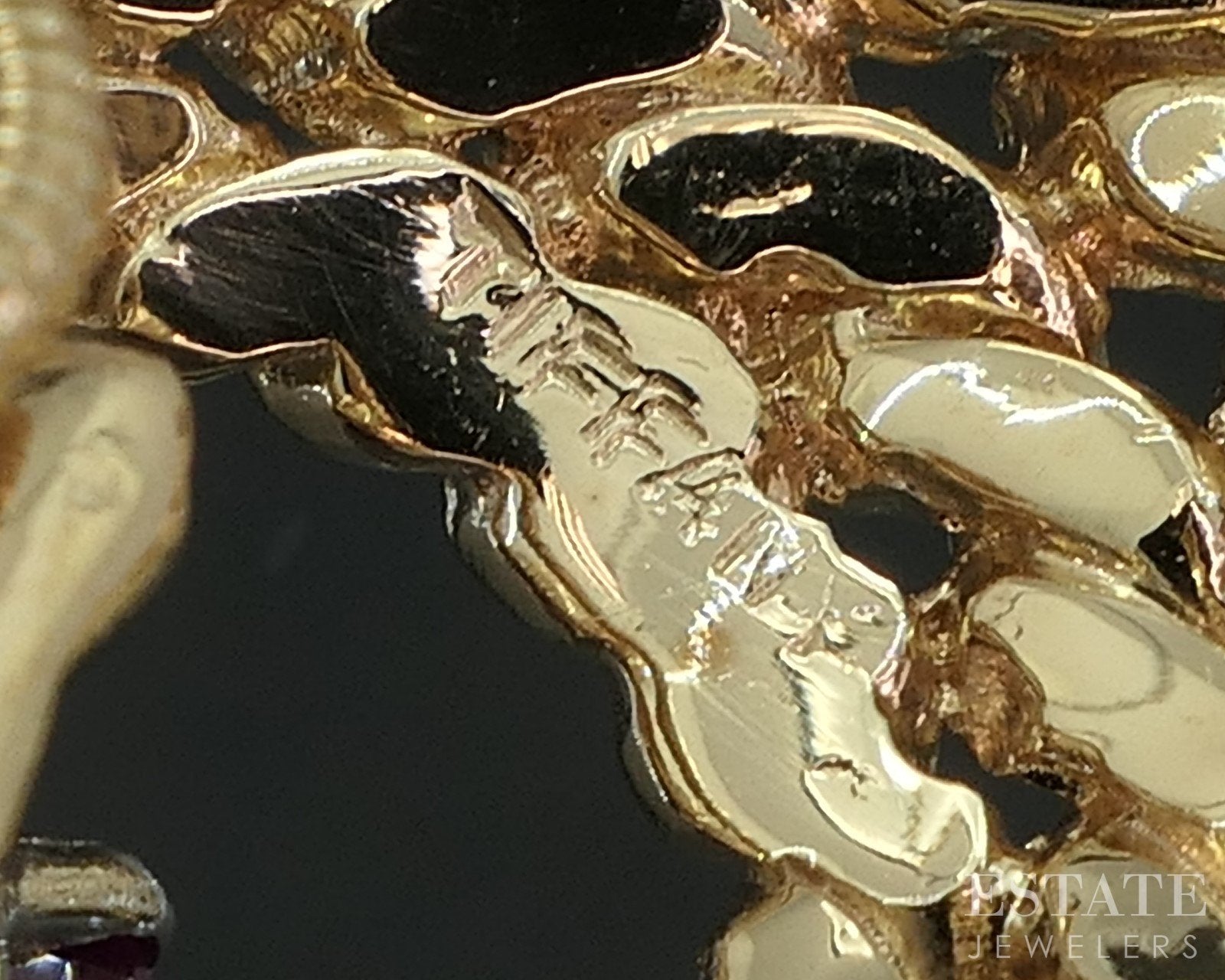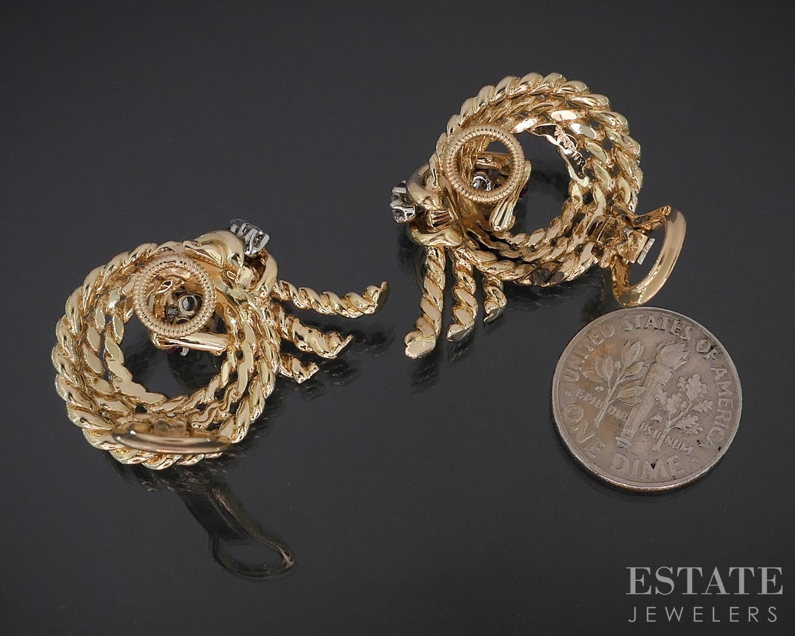 Additional Info: A stunning blend of vintage elegance and timeless craftsmanship, these mid-century Tiffany & Co. clip-on earrings are a rare and refined statement. Crafted in rich 14k yellow gold, the design features a distinctive twisted rope motif that adds texture and dimension. At the center of each earring lies round-cut Rubies, radiating deep red brilliance, alternating with sparkling round Diamonds that enhance its fiery hue. The intricate rope design frames the gemstones with sculptural detail, showcasing Tiffany’s hallmark attention to form and finish. Designed as omega back clip-ons for comfortable wear without the need for pierced ears, these earrings are a perfect choice for collectors and lovers of bold, classic luxury.