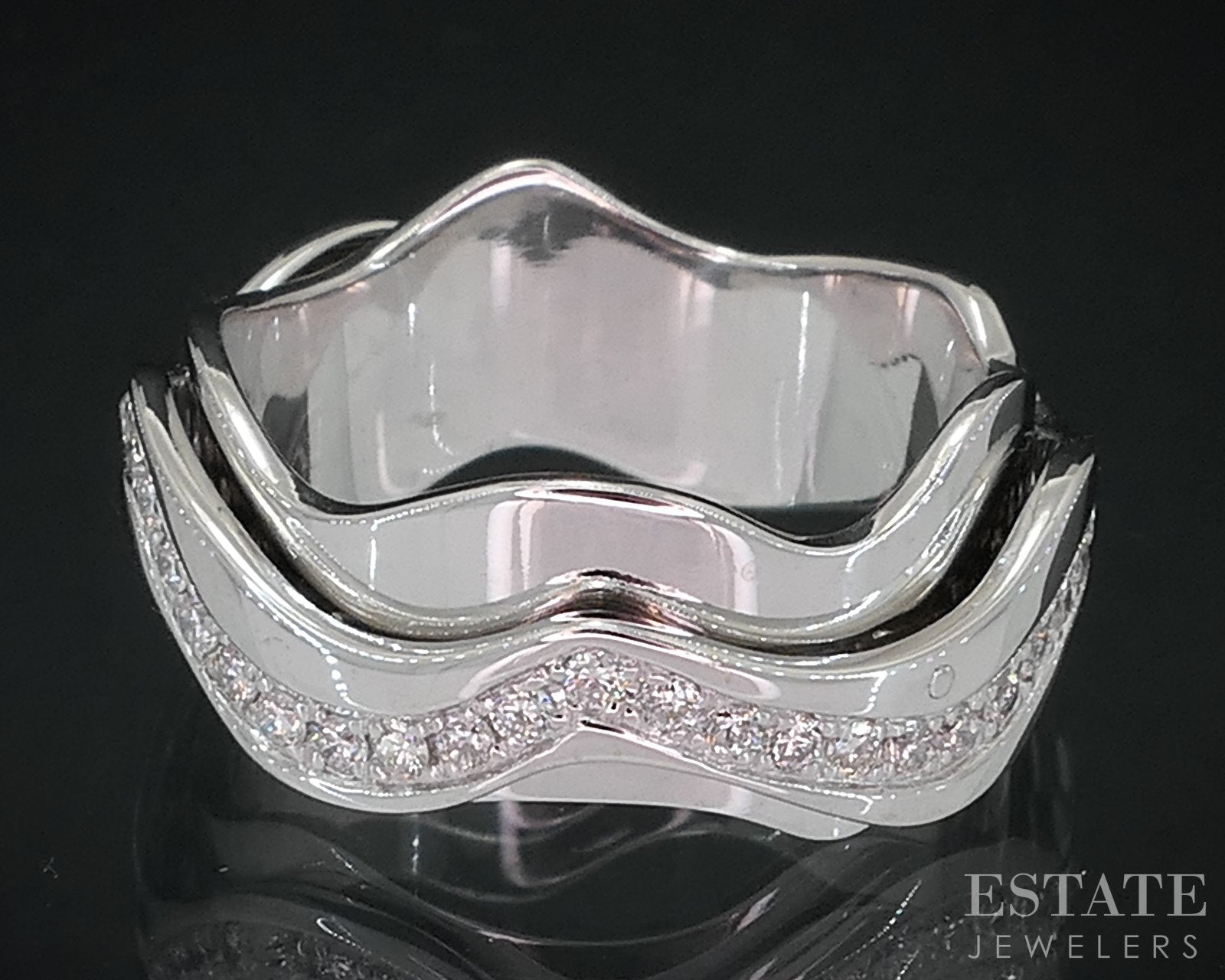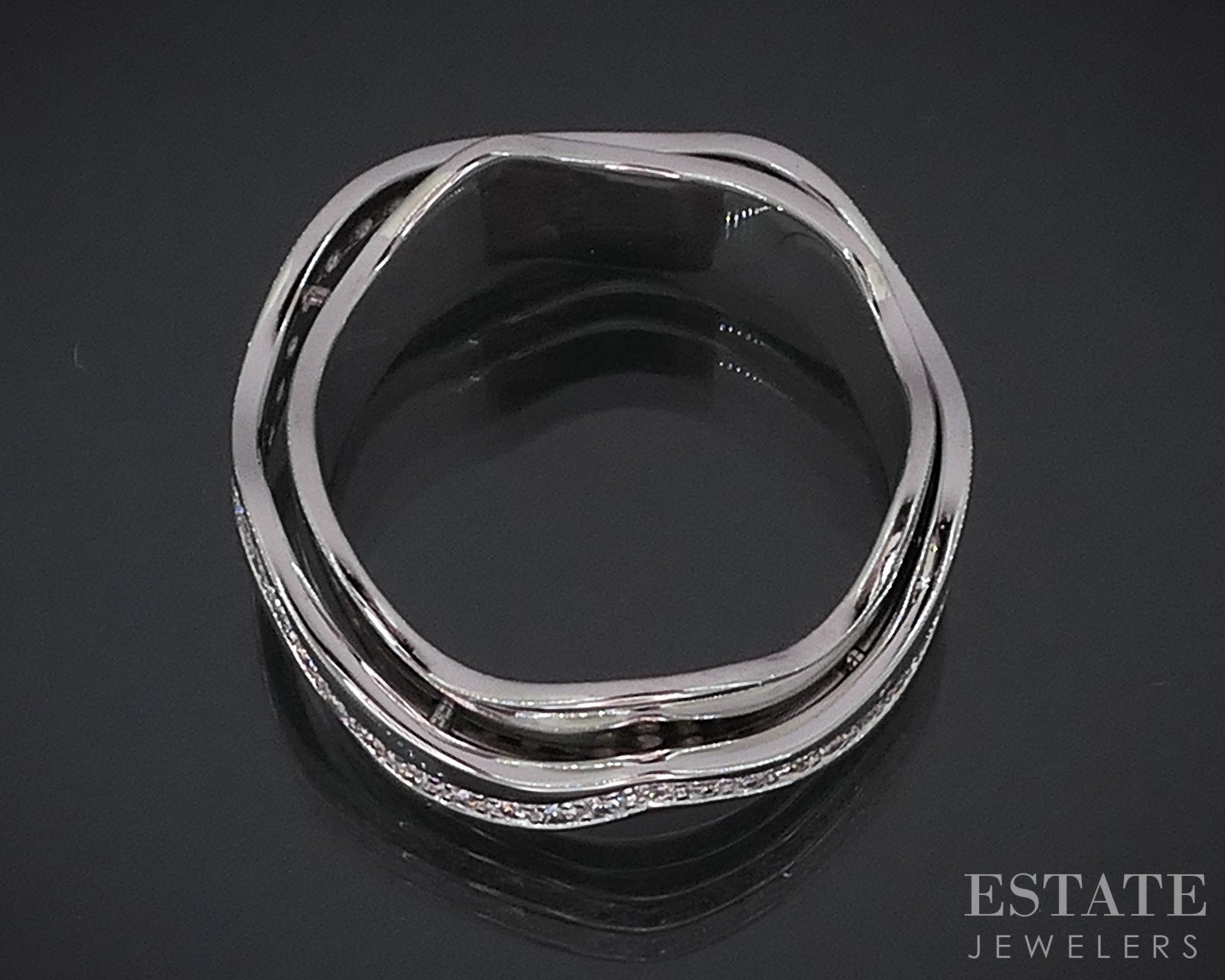Additional Info: Unique free form band with round cut Diamonds around the entire piece. Middle section that holds the Diamonds spin around the inner band. One of a kind design! 8mm wide.
