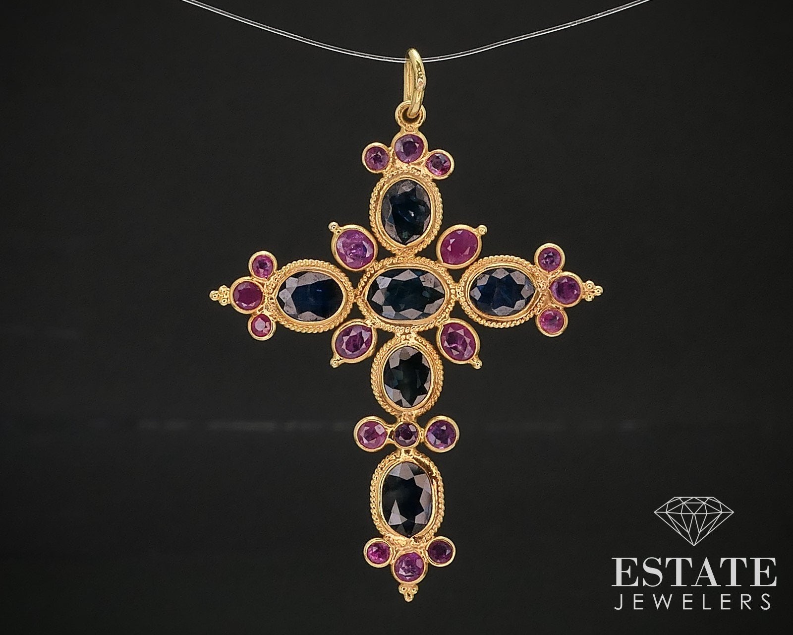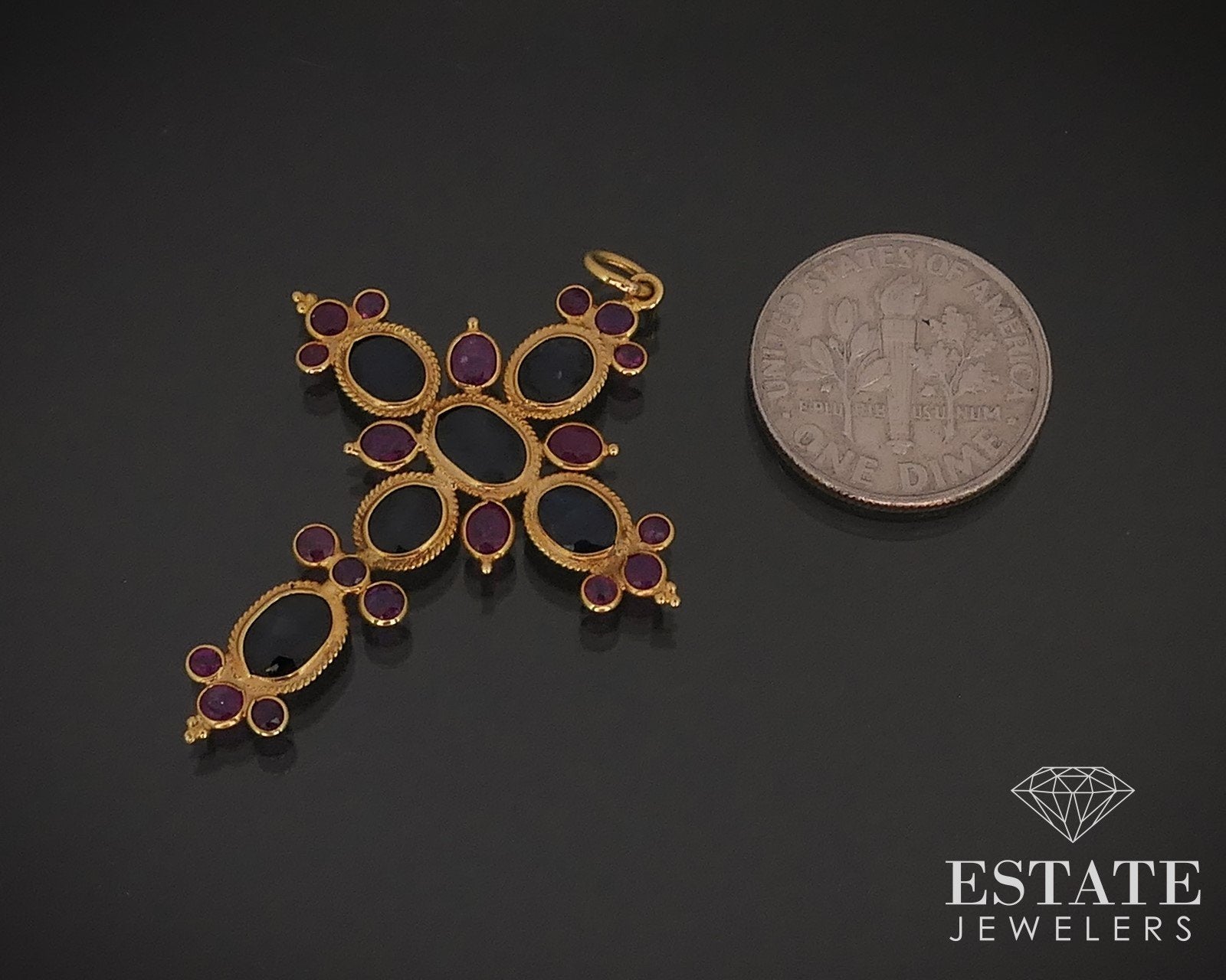 Eye catching mid century cross pendant with natural ruby gems surrounding the vivid blue sapphires. 1-5/8"L including bale. Stamped 18k