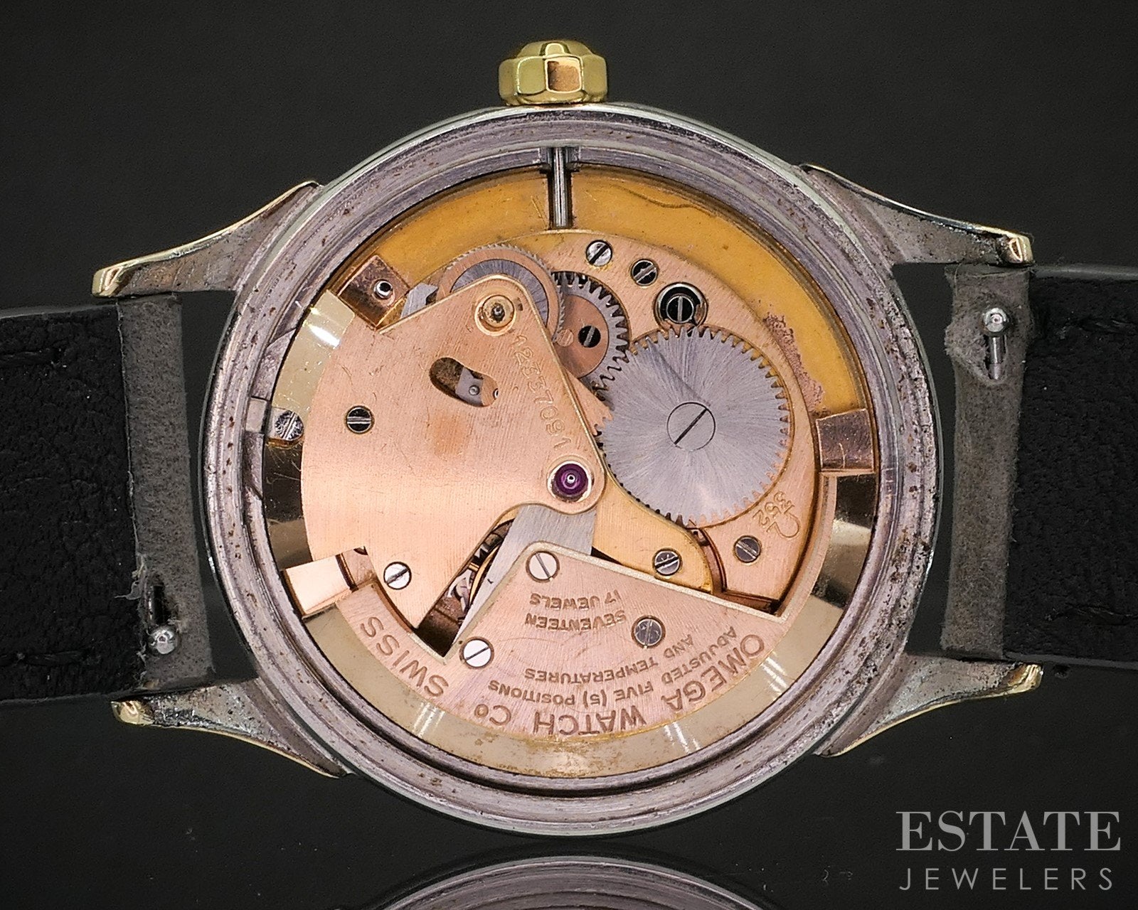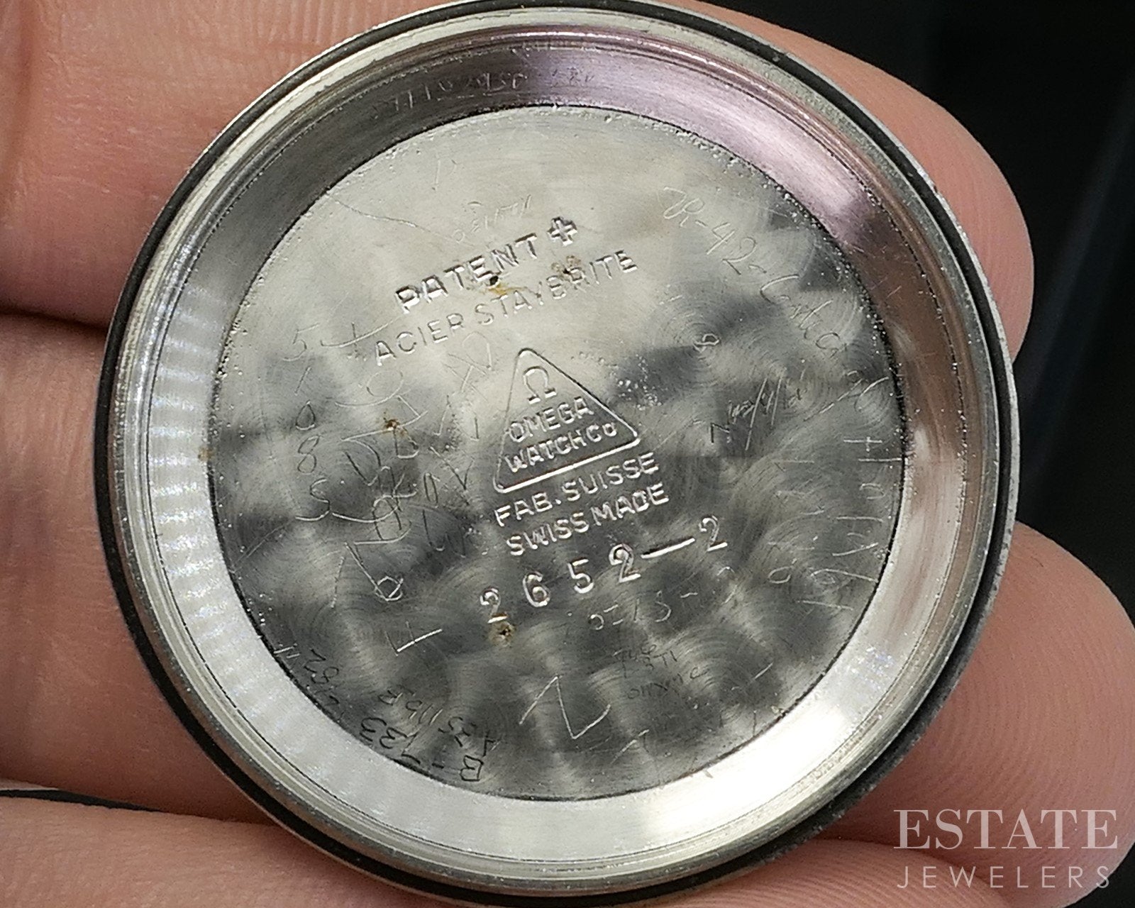 Additional Info: Handsome men's watch from Omega with a mint pie pan/crosshair dial and unique dog leg style lugs. Case reference number 2652-2. Automatic watch winds up and runs great. Comes with a gold plated Omega buckle