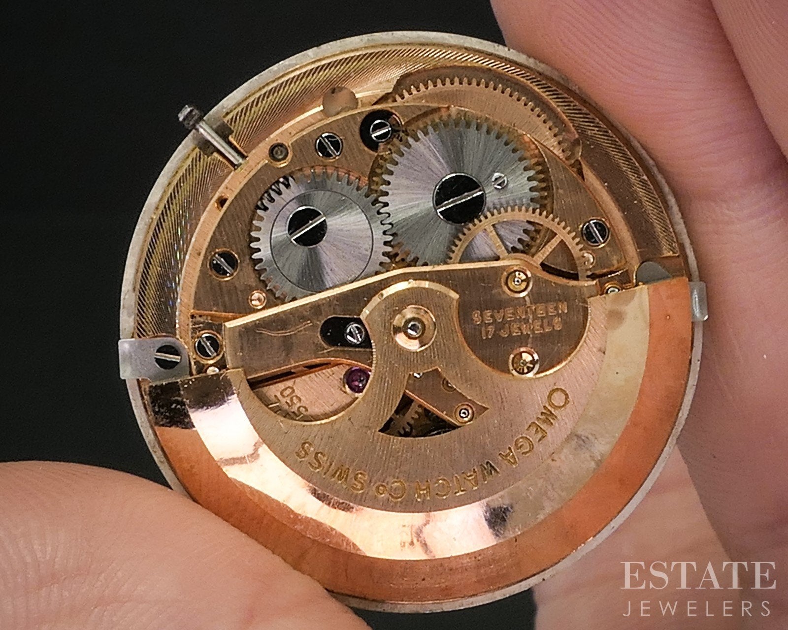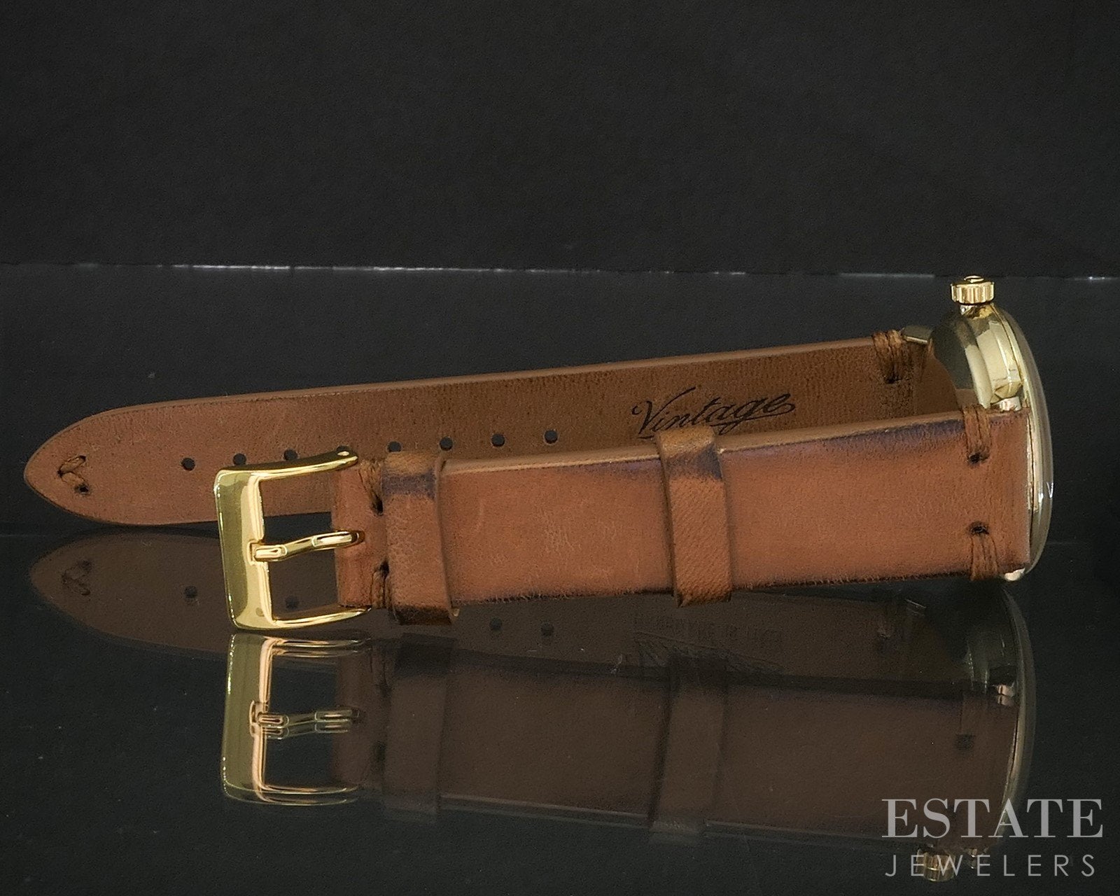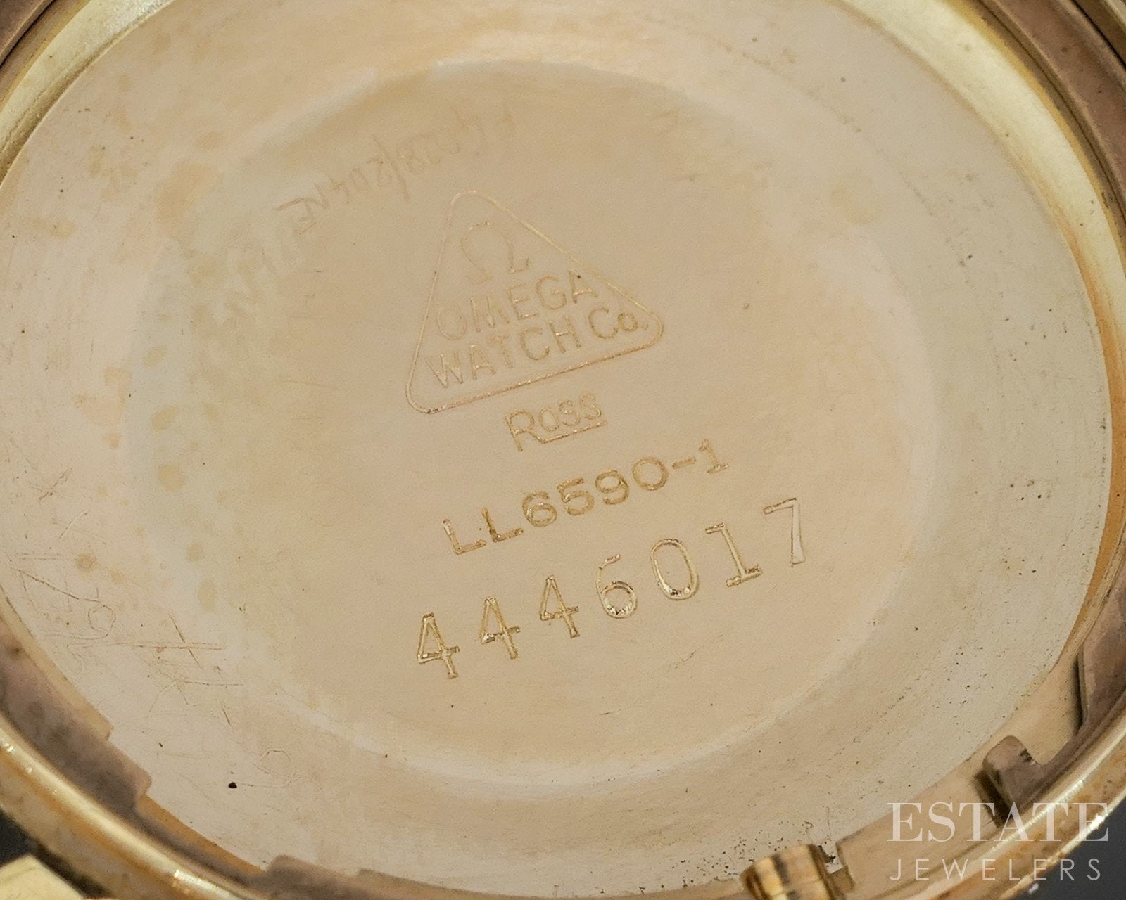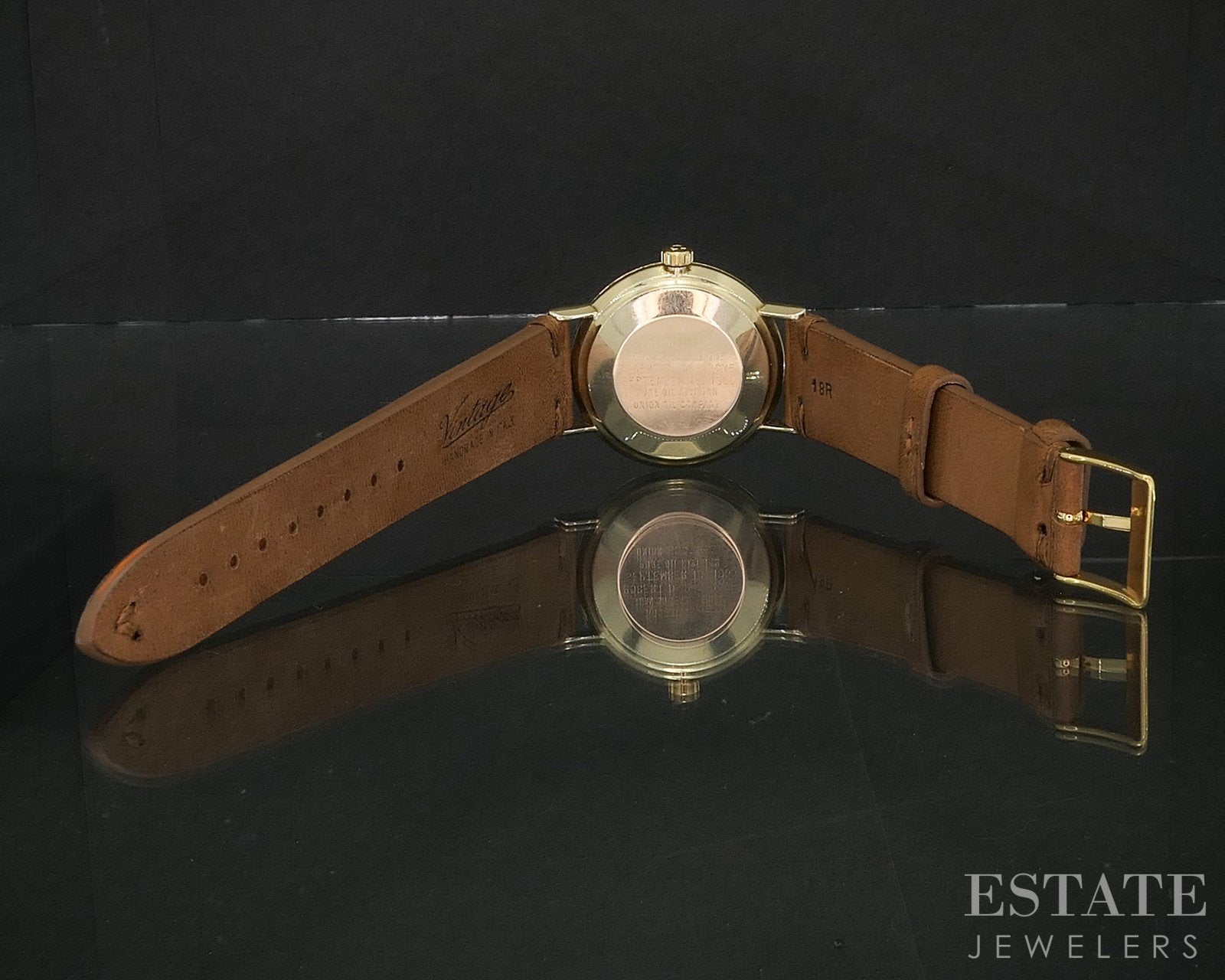 Additional Info: Handsome men's watch from Omega with a solid 14k gold case. Yellow gold stick markers and hands contrast the beautiful even orange-ish sunburst color to the tropical dial. Case reference number LL6590-1. Automatic watch with a caliber 550 movement that winds up and runs great. This beauty comes unpolished and complete with a new correct Omega crown and brown vintage strap.