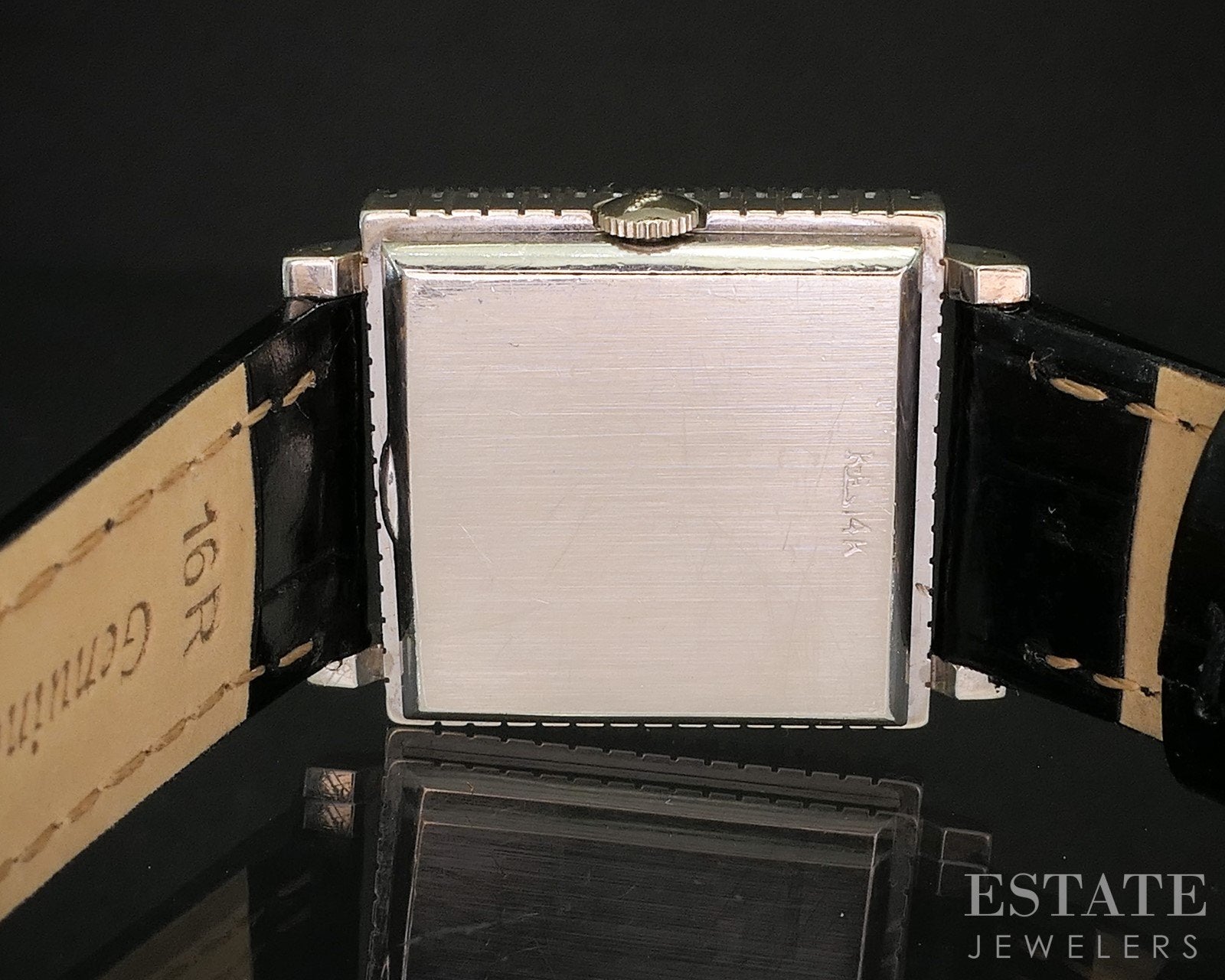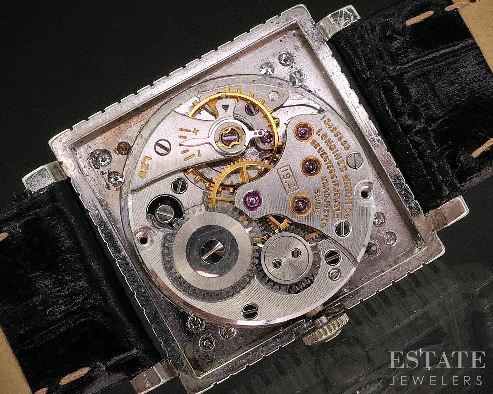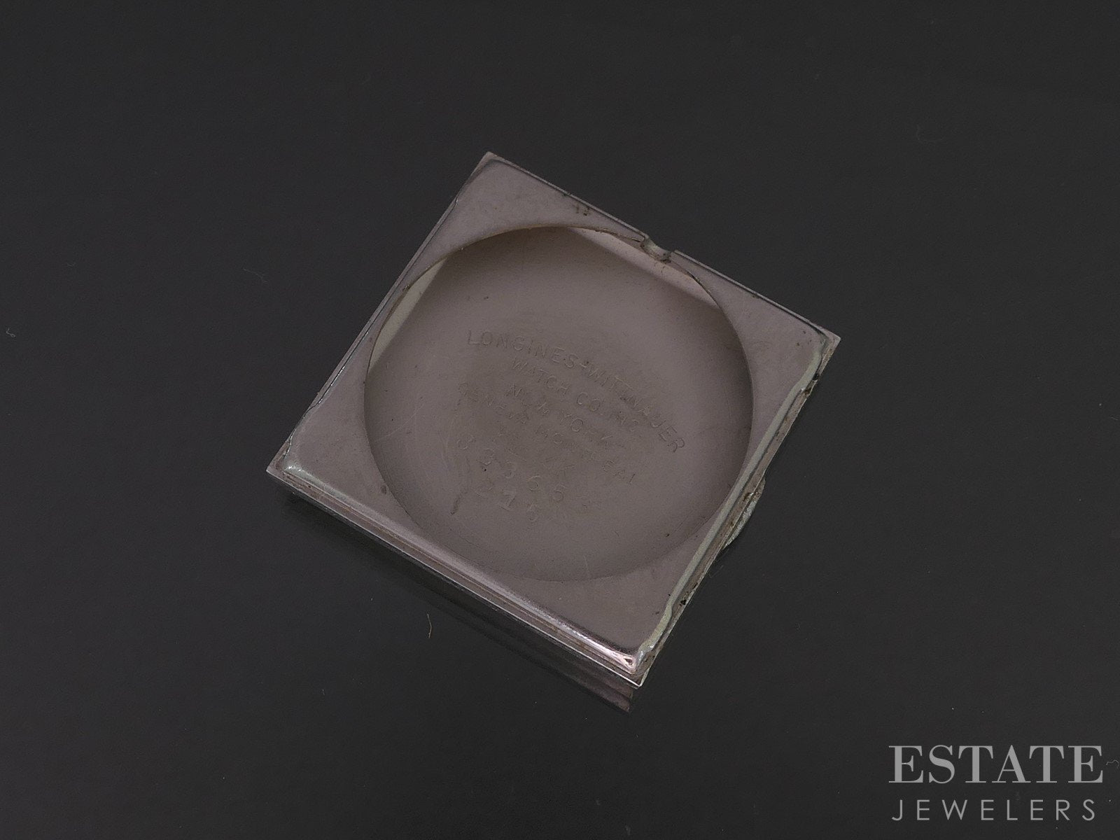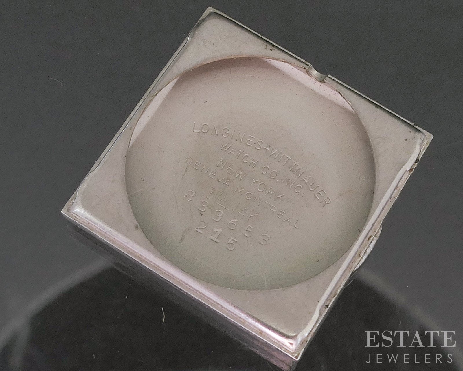 Additional Info: Stunning midsize men's or ladies watch from Longines with a square solid 14k gold case. Sparkling Diamonds pave' set on the outer edge of the case and as the bezel underneath the crystal! Very unique case. Manual wind watch winds up and runs great.