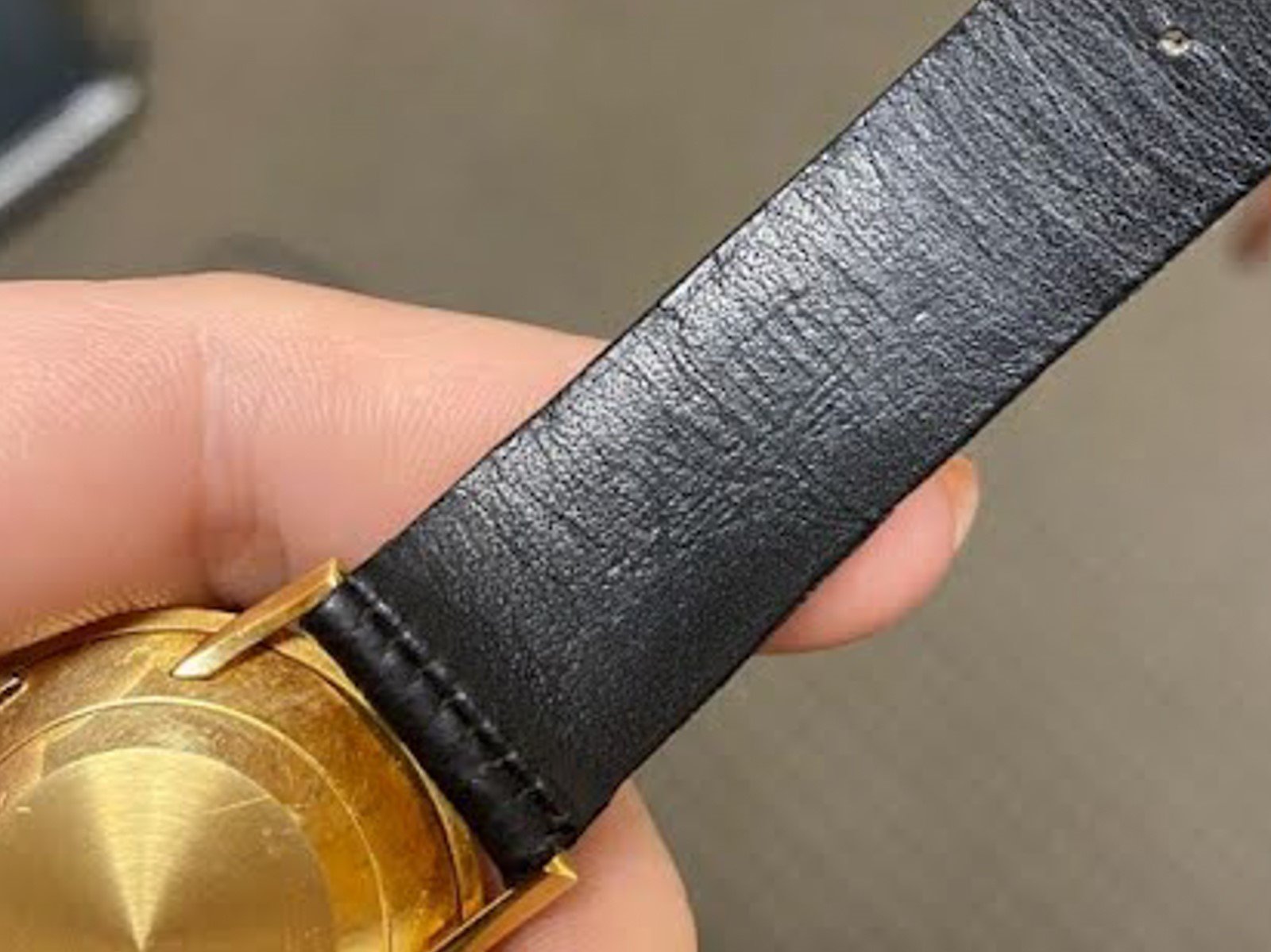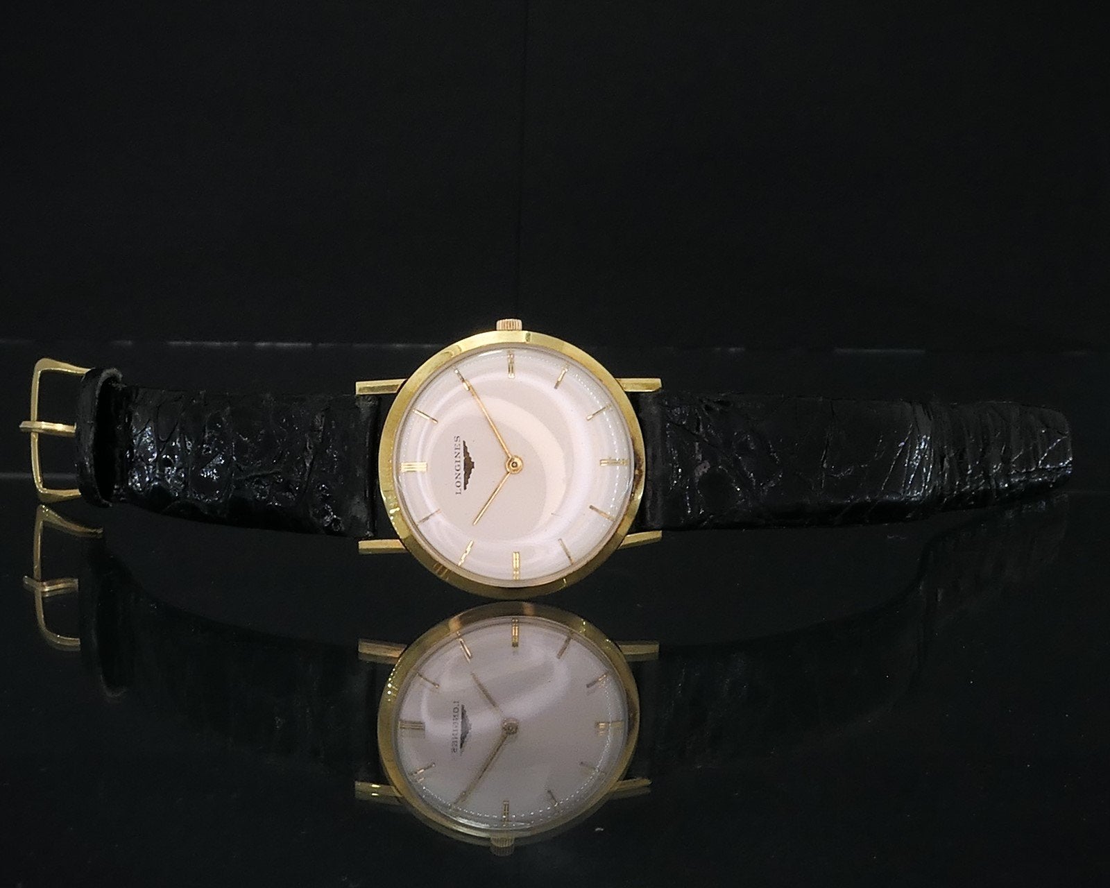 Additional Info: Handsome all-original men's dress watch from Longines with a solid gold thin case. Matching original signed 18k buckle and black leather band. The fact that this still has the original band is unique. Most of the time these old bands will deteriorate or dry rot, but in this situation, it's still very wearable. Case reference number 615.966. Watch winds up and runs great. It still has the original box and booklet.