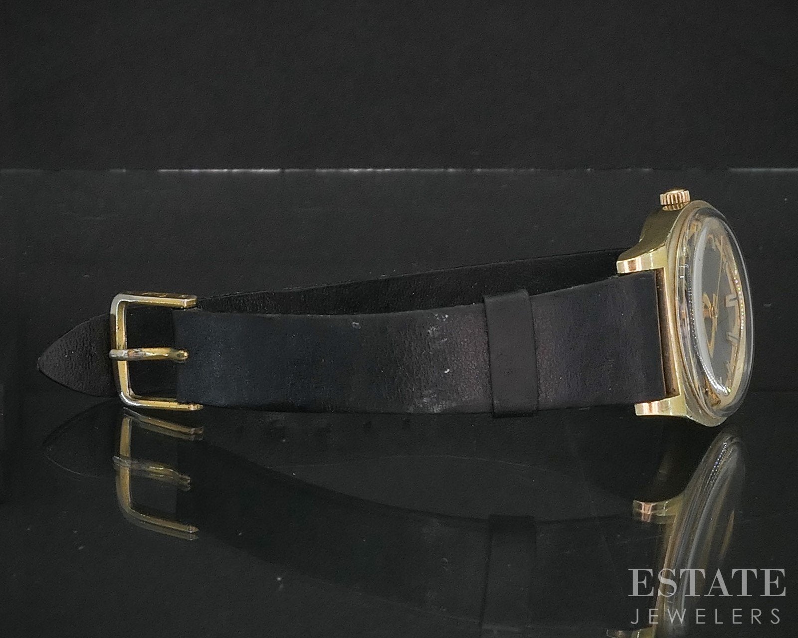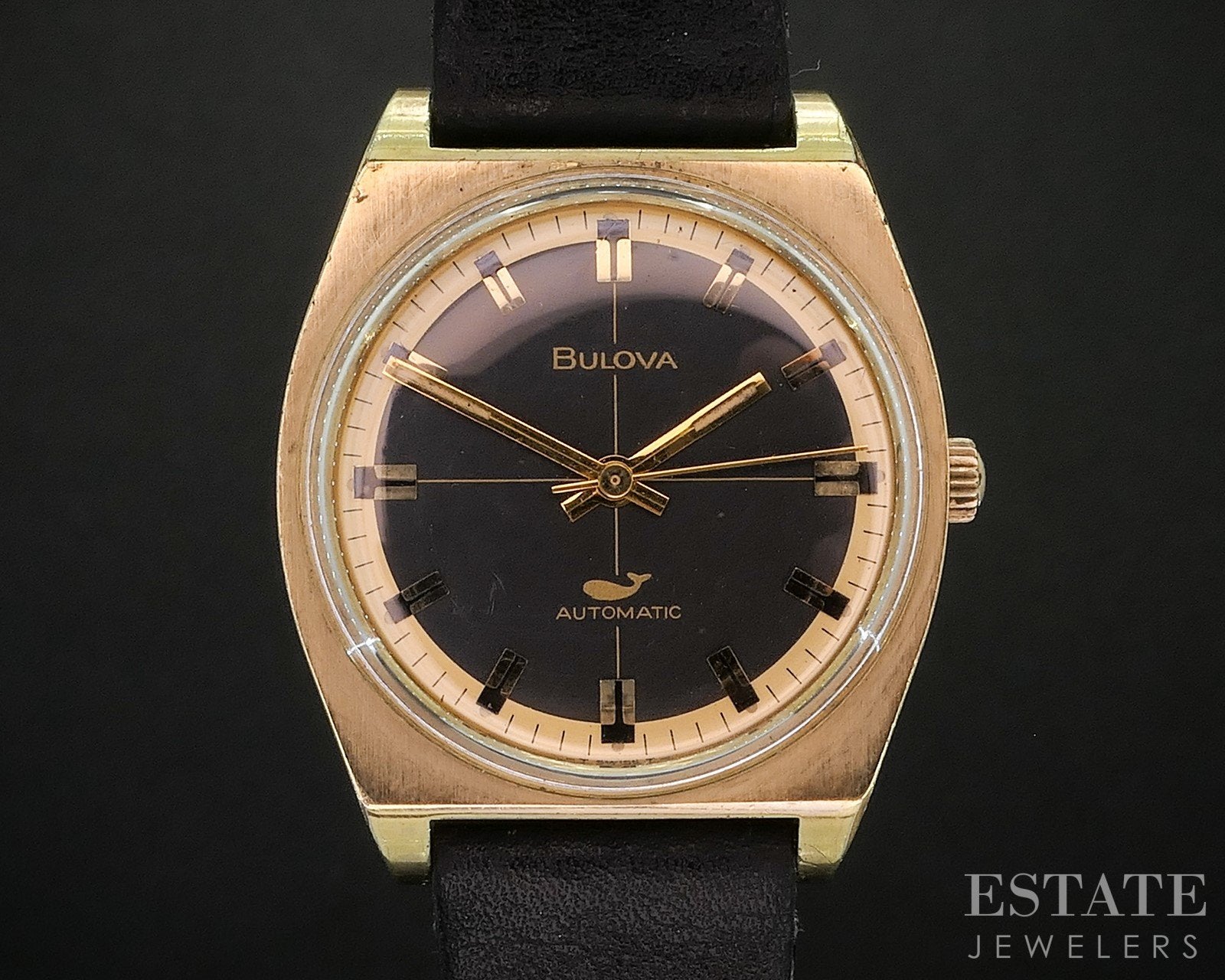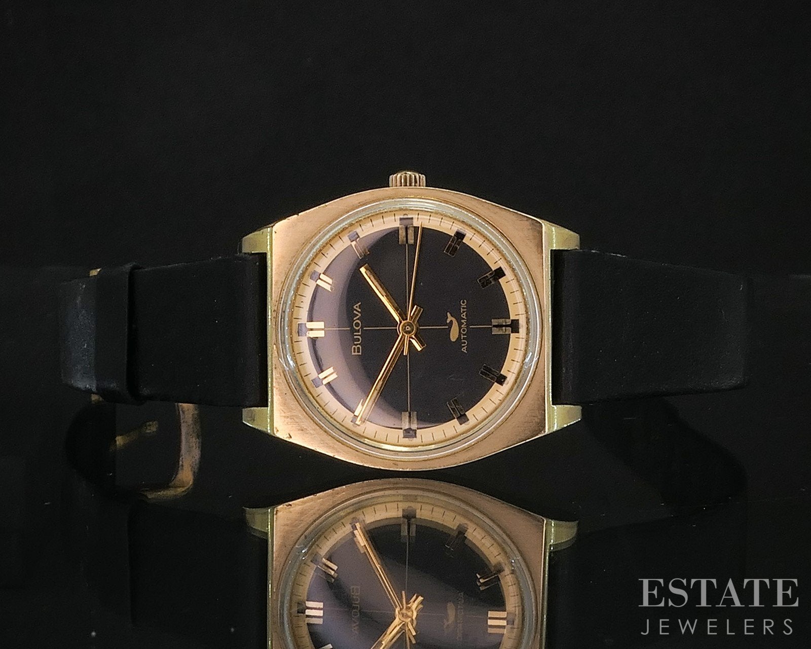 Additional Info: Handsome automatic watch from Bulova. Rare, mint black dial with a gold tracks on the outside and a crosshair in the middle. Watch winds up and runs!