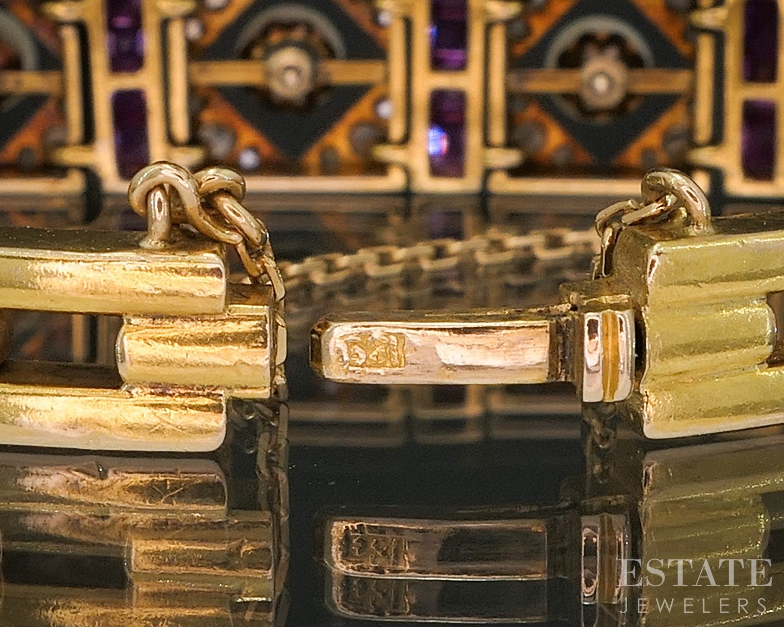 Additional Info: This striking retro bracelet is crafted in a luxurious combination of 18k yellow gold and platinum, showcasing the bold elegance of mid-20th-century design. The bracelet features lustrous pearls framed by vivid natural Rubies and glittering rose-cut Diamonds, creating a captivating interplay of color and texture. The warm glow of yellow gold contrasts beautifully with the cool shimmer of platinum, enhancing the brilliance of each gemstone. Exquisitely detailed and richly dimensional, this bracelet embodies the glamour and sophistication of the Retro era — a statement piece of timeless beauty and refined craftsmanship!