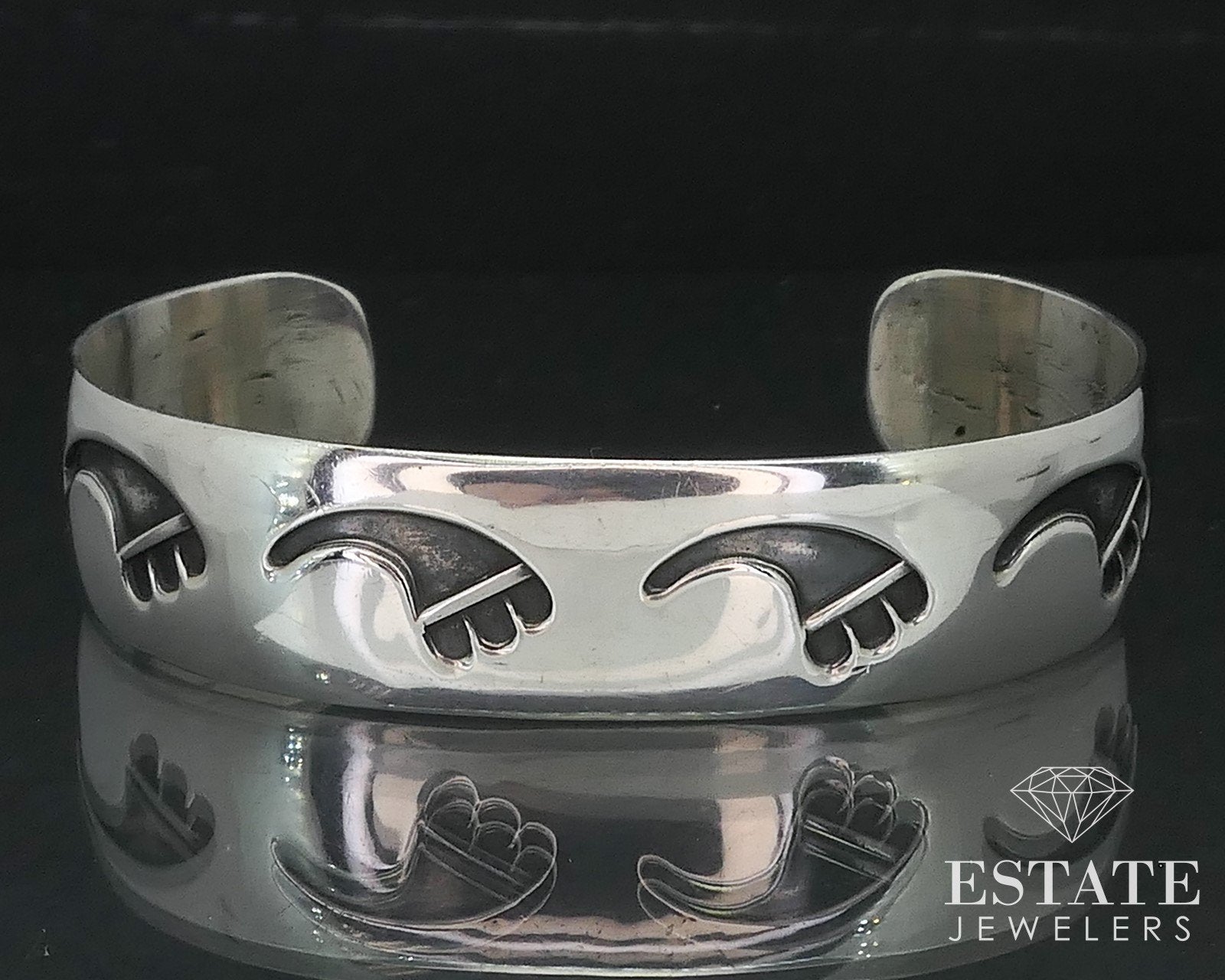 Genuine Native American sterling cuff with unique overlay designs. 15mm tall face. Fits approximate 7" wrist. tested sterling