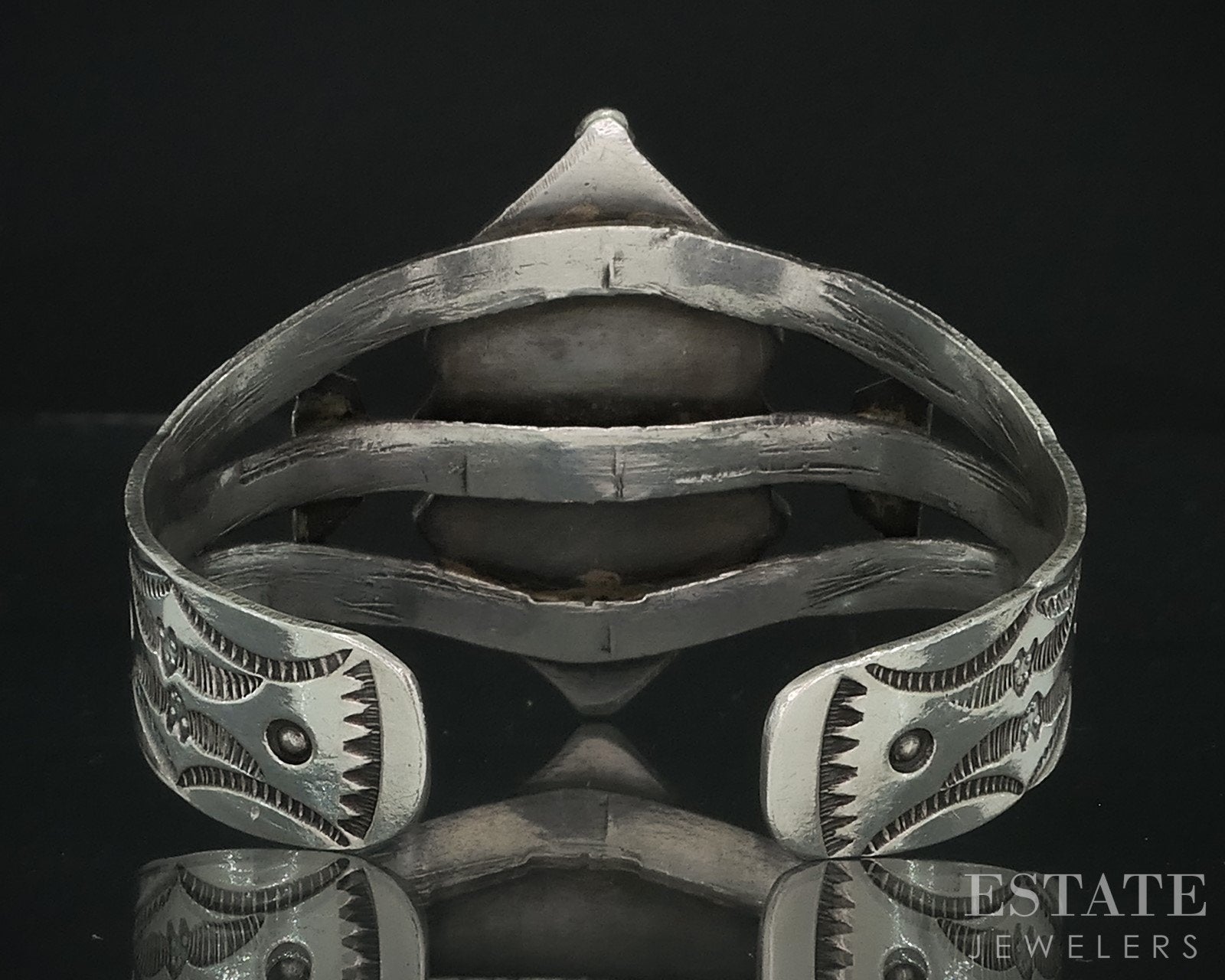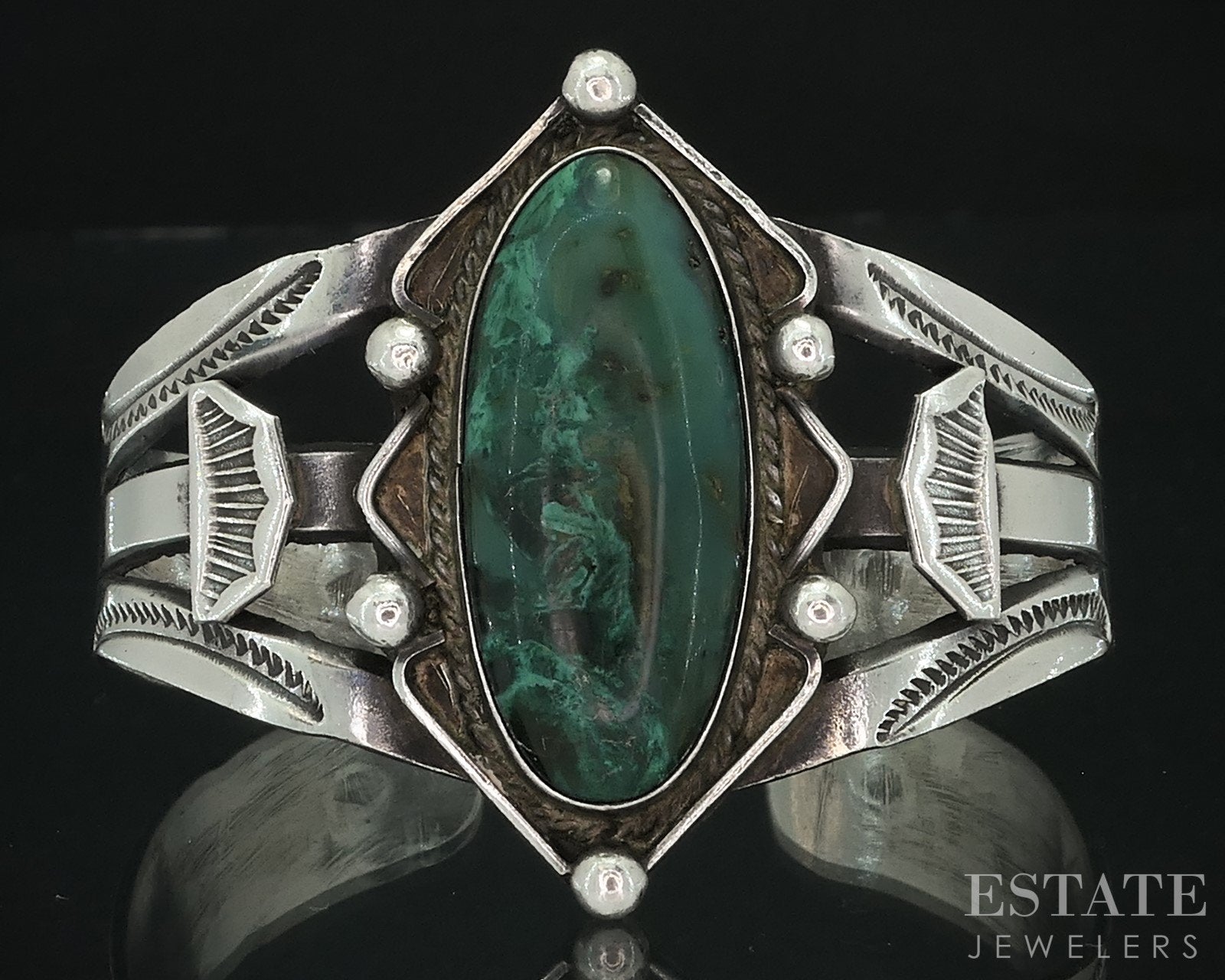 Additional Info: Large Native American cuff bracelet with a bezel set natural Green Turquoise gem and beaded and engraved designs along the side. 43mm tall face.