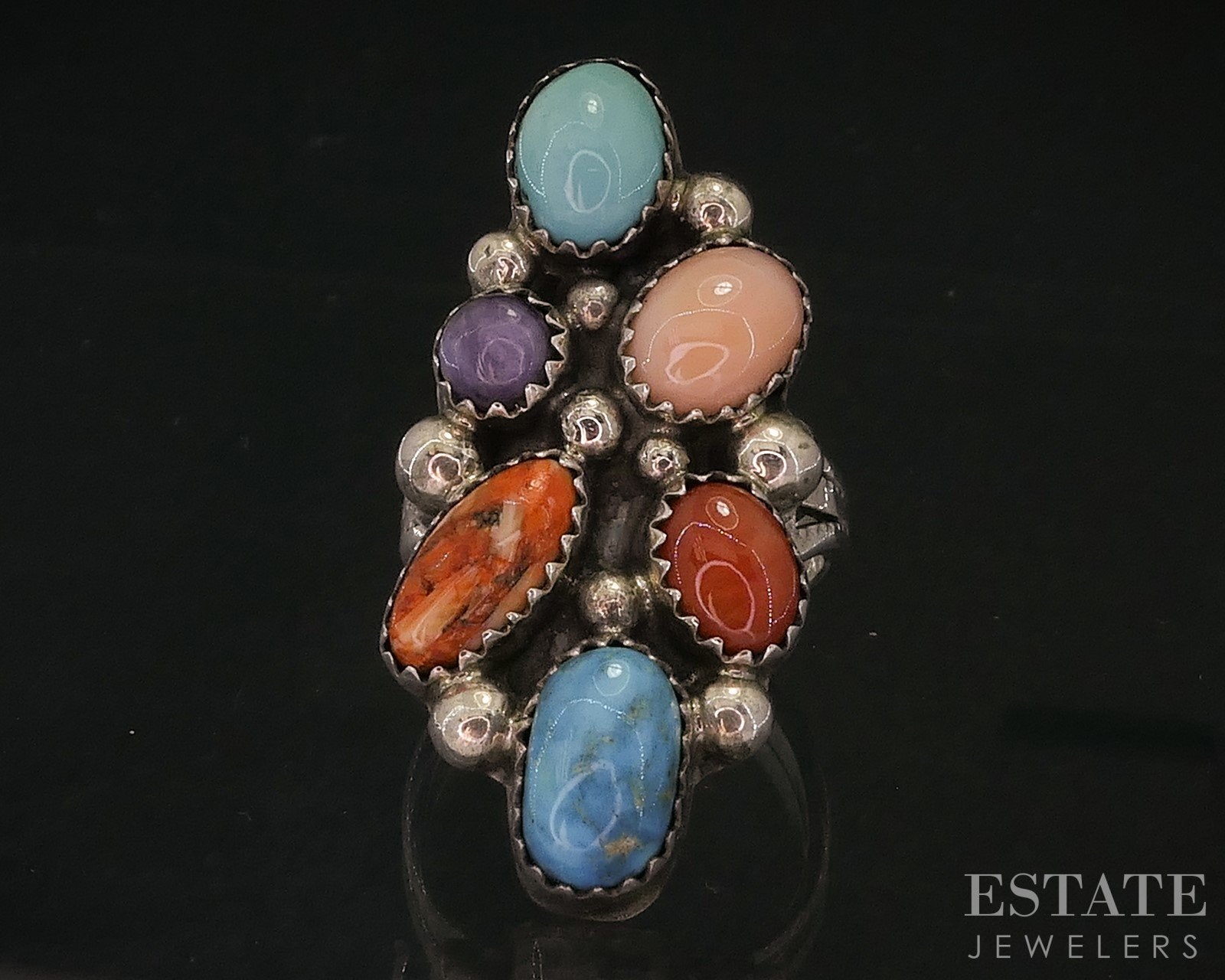 Vintage Sterling Natural Multi Gem Navajo Running Bear Ladies Ring 9g i17917
