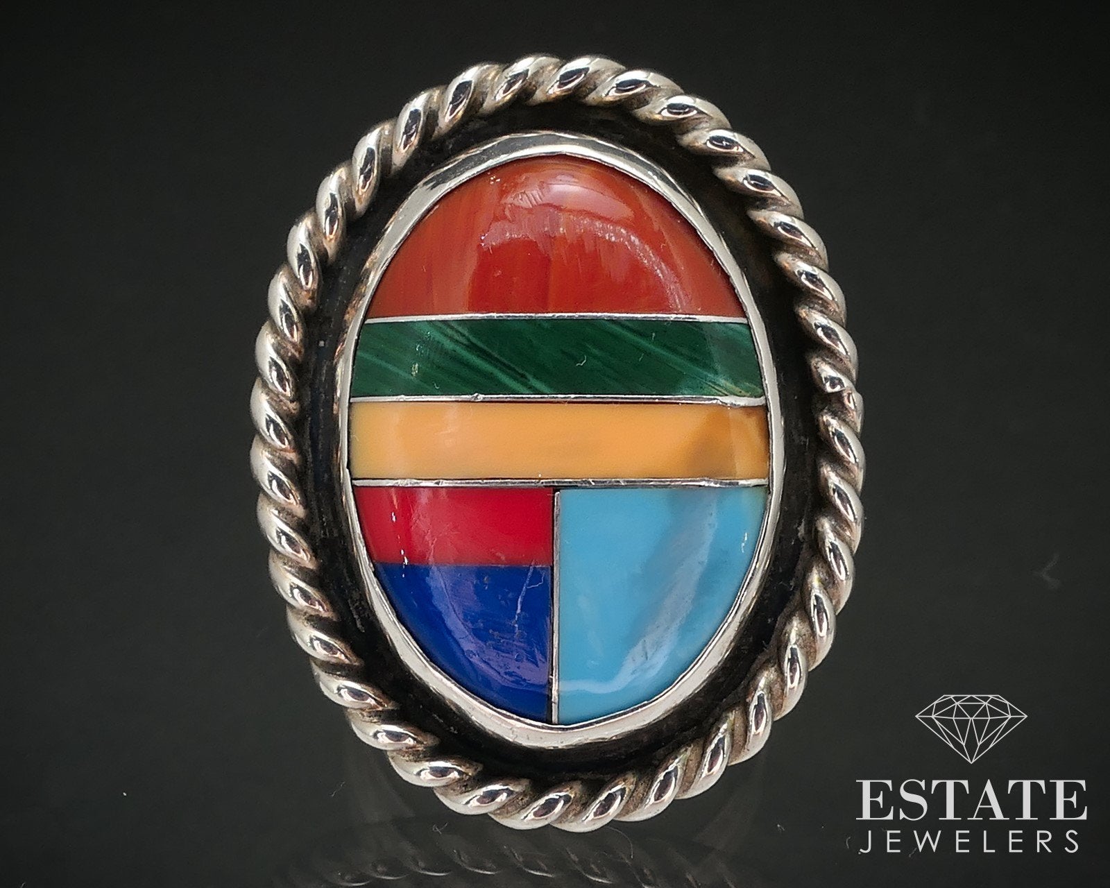 Vintage Sterling Navajo Natural Multi Gem Willie Saiz Large Ring 11g i17287
