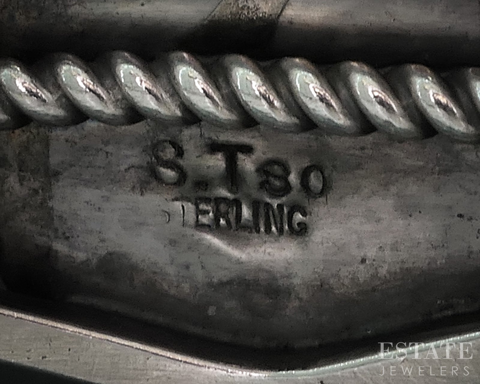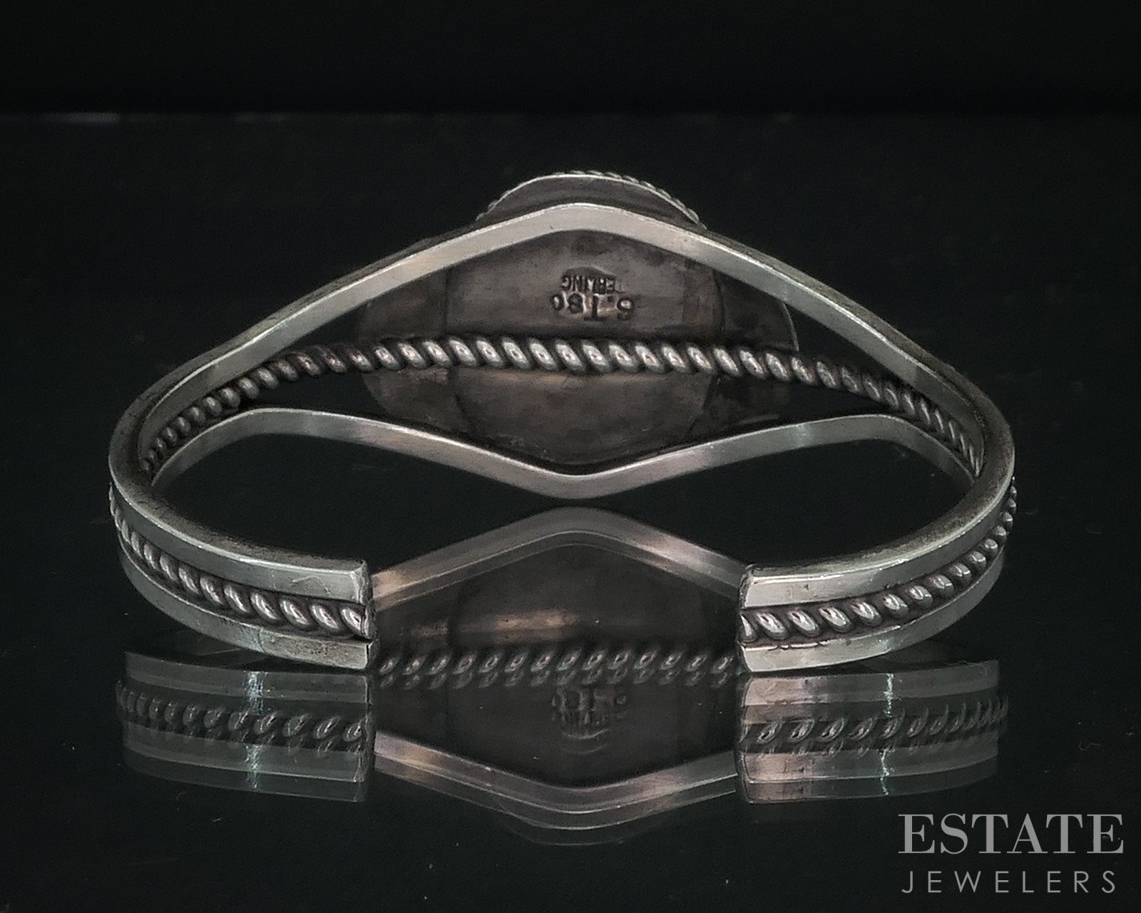 Unique Native American cuff bracelet with a stunning 22mm by 16mm turquois bezel set up front. Incredible matrix to the stone. Fits an approximate 6.5-7" wrist. Stamped T. Tso sterling
