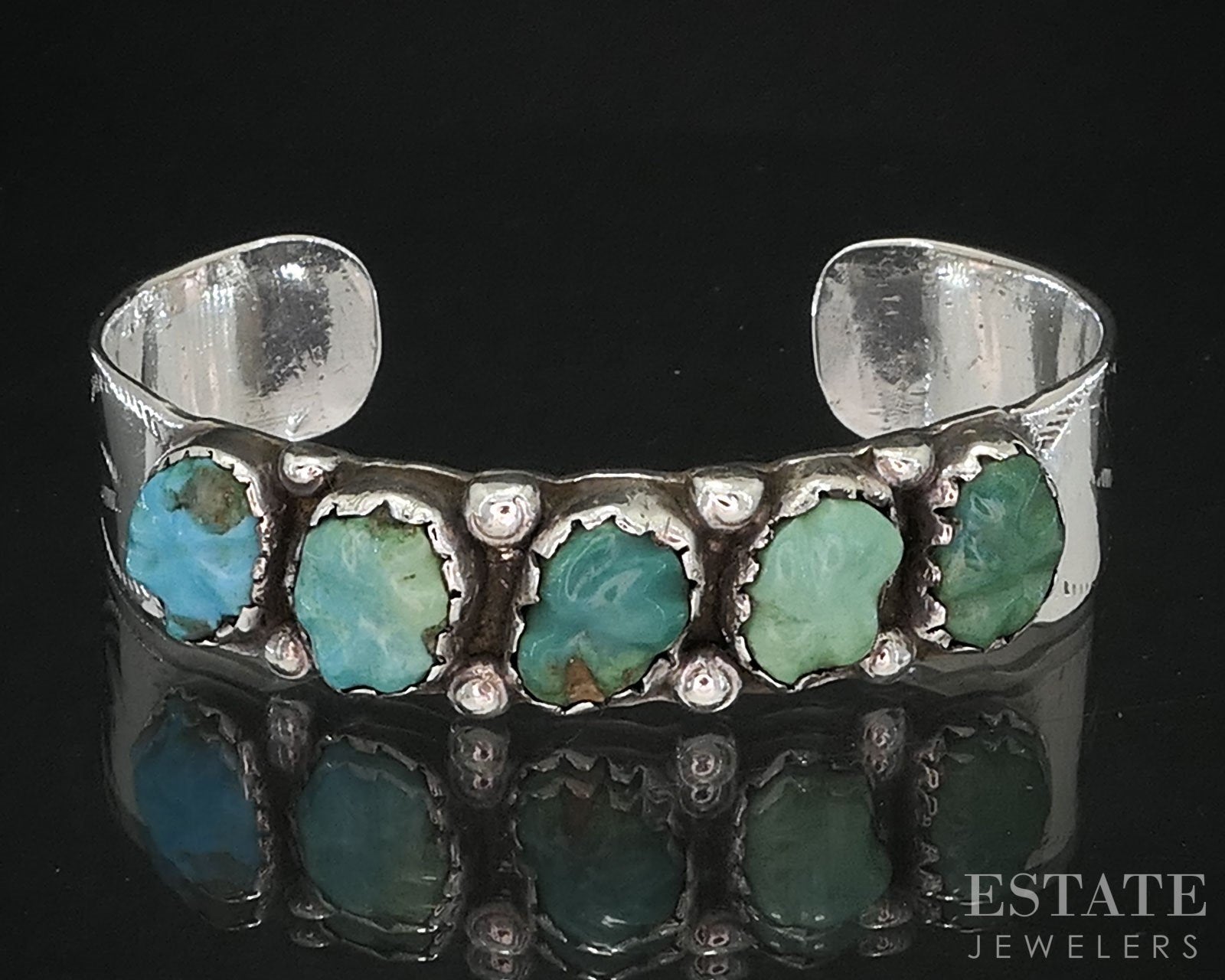 Additional Info: Lovely signed Native American cuff bracelet with five different colored natural Turquoise gems bezel set.