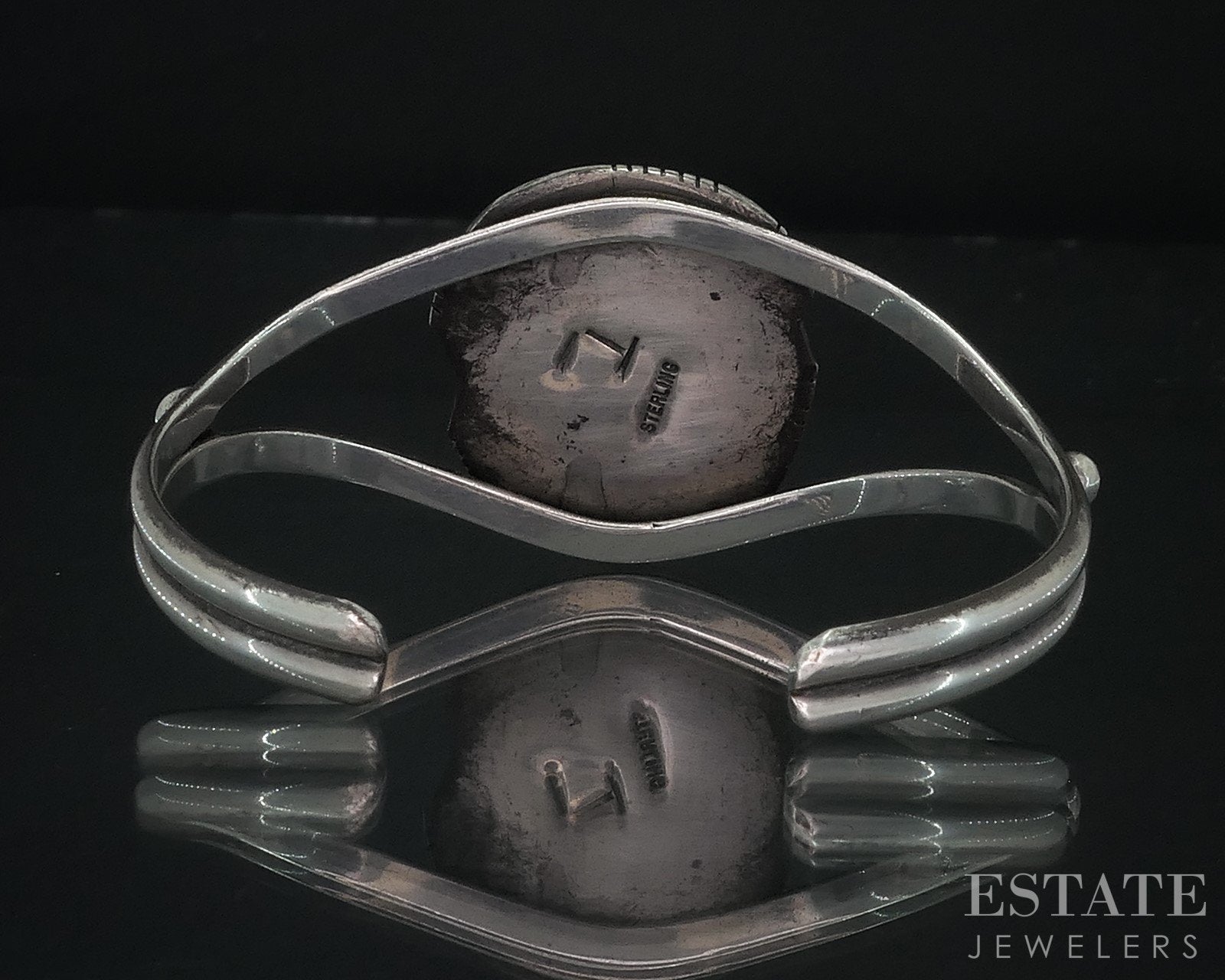 Unique shadowbox style Native American cuff bracelet with a stunning 21mm by 18mm turquois bezel set up front. Incredible matrix to the stone. Fits an approximate 6.5-7" wrist. Stamped TL sterling