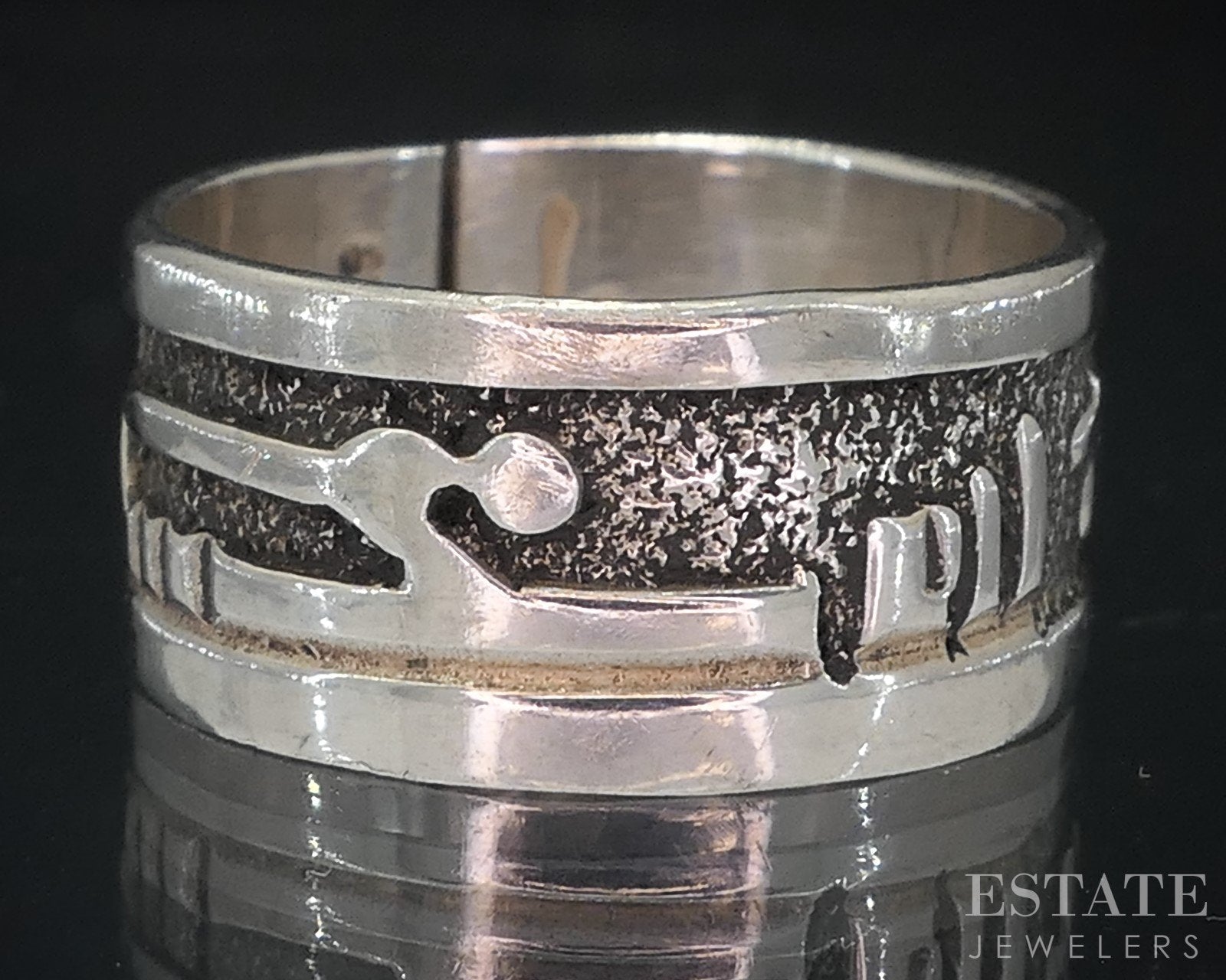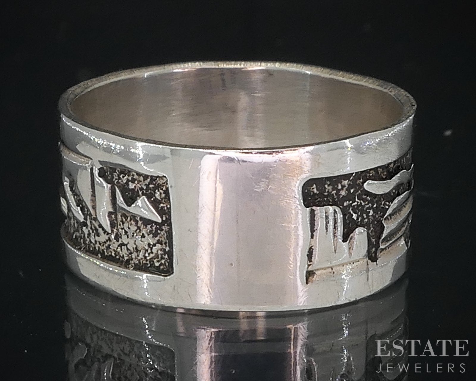 Additional Info: Unique Native American band ring with Navajo overlay designs all around it. 9mm tall face.