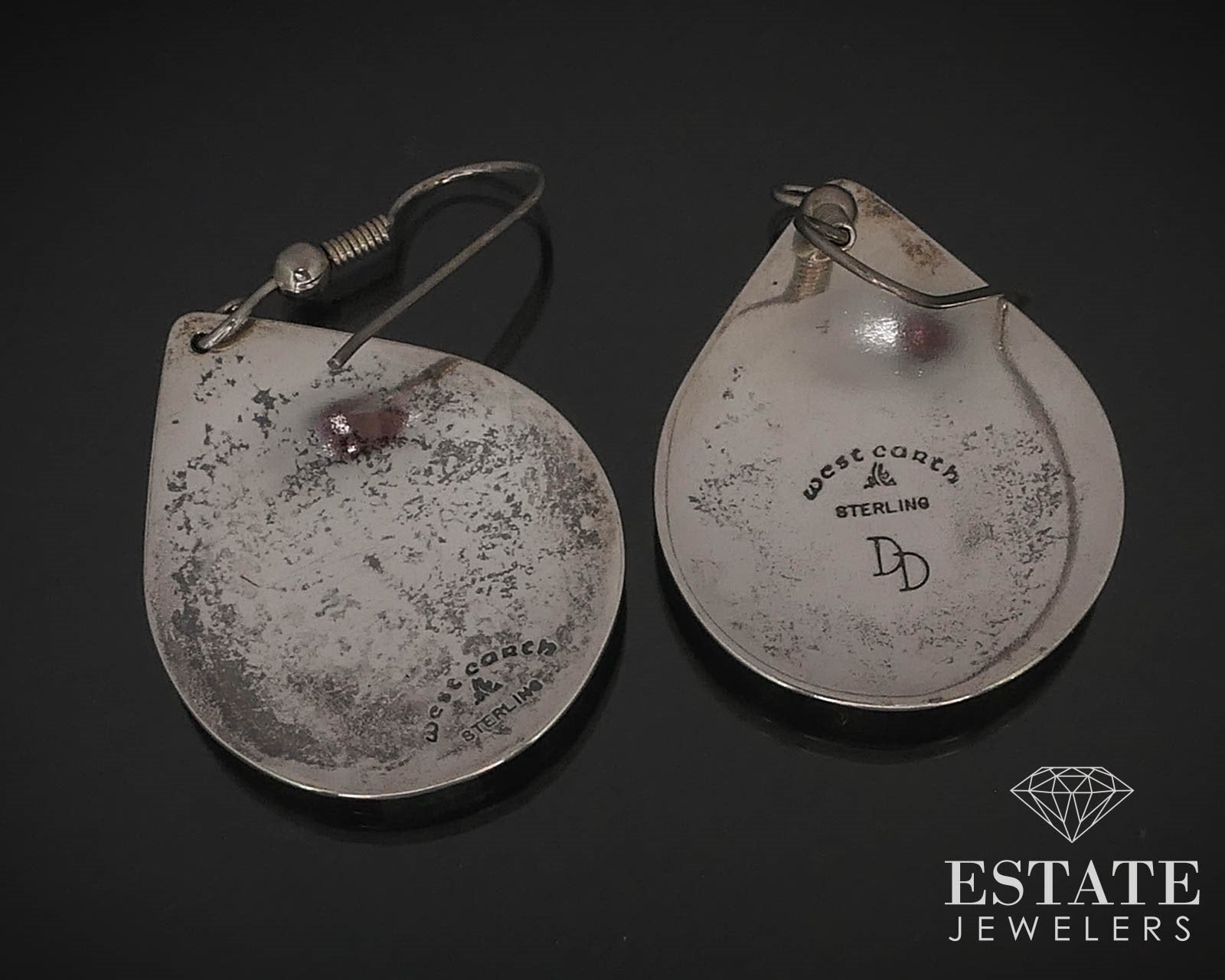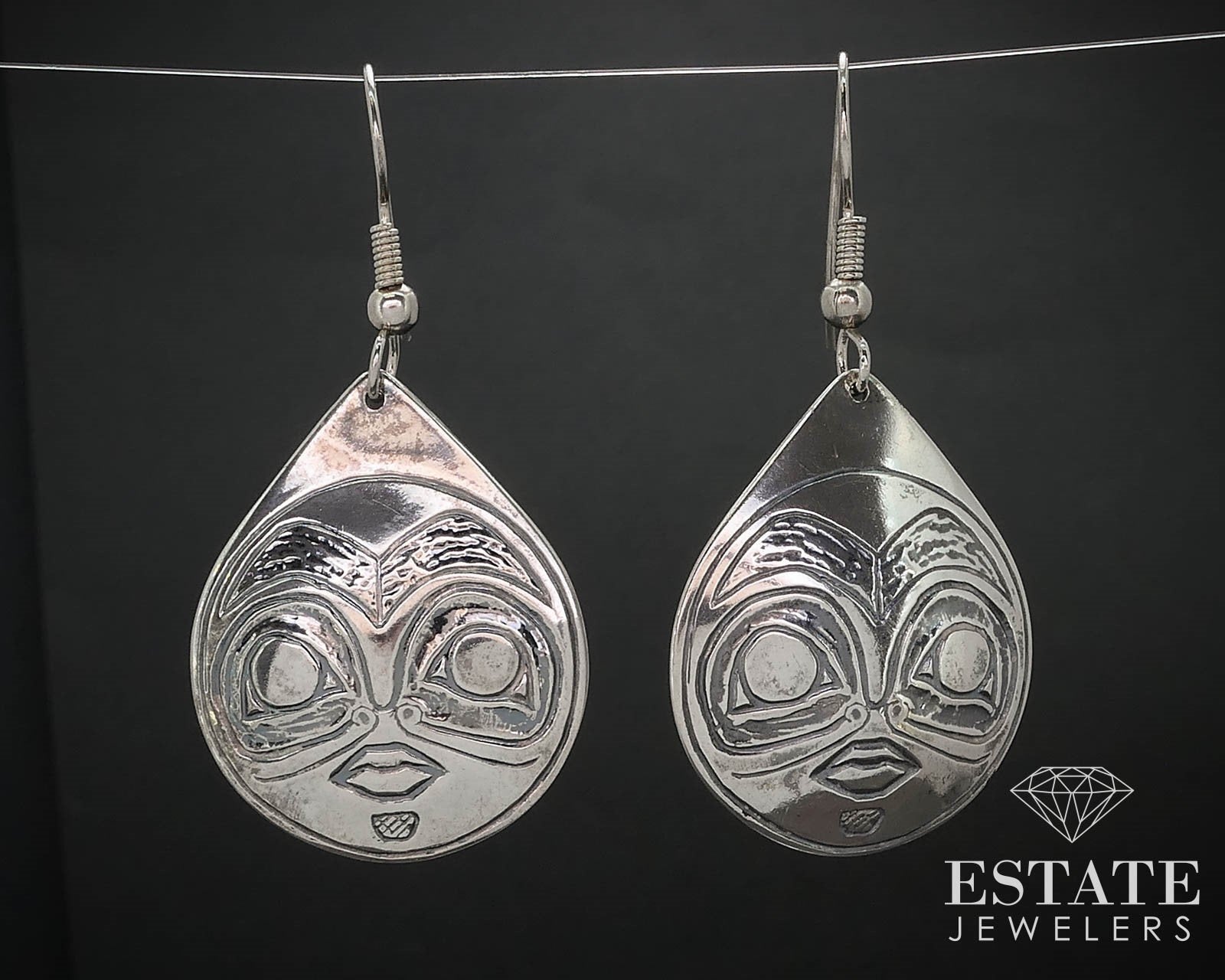 Genuine Native American earrings with face overlay designs to the tear drop designs. Stamped DD sterling 1-7/8"L