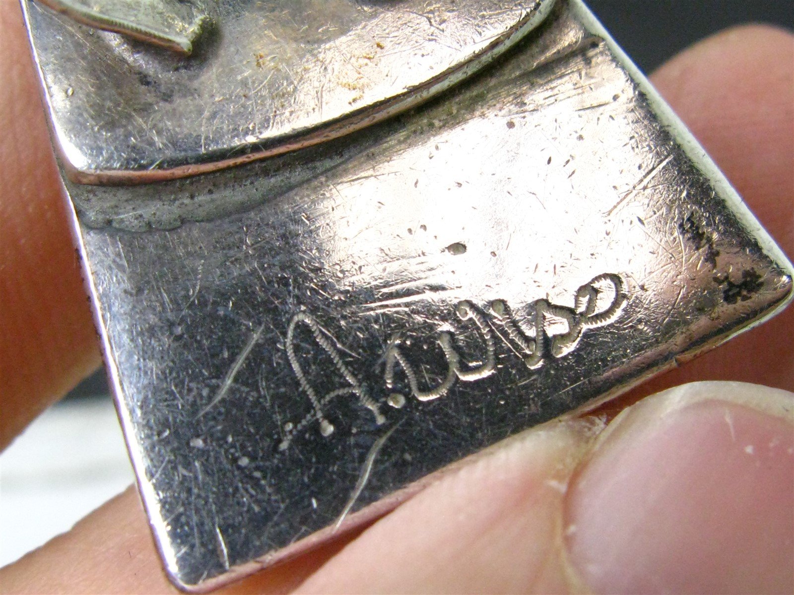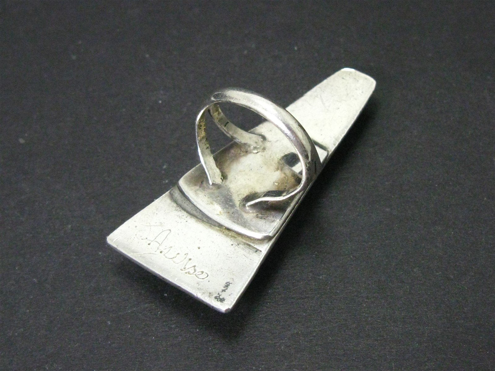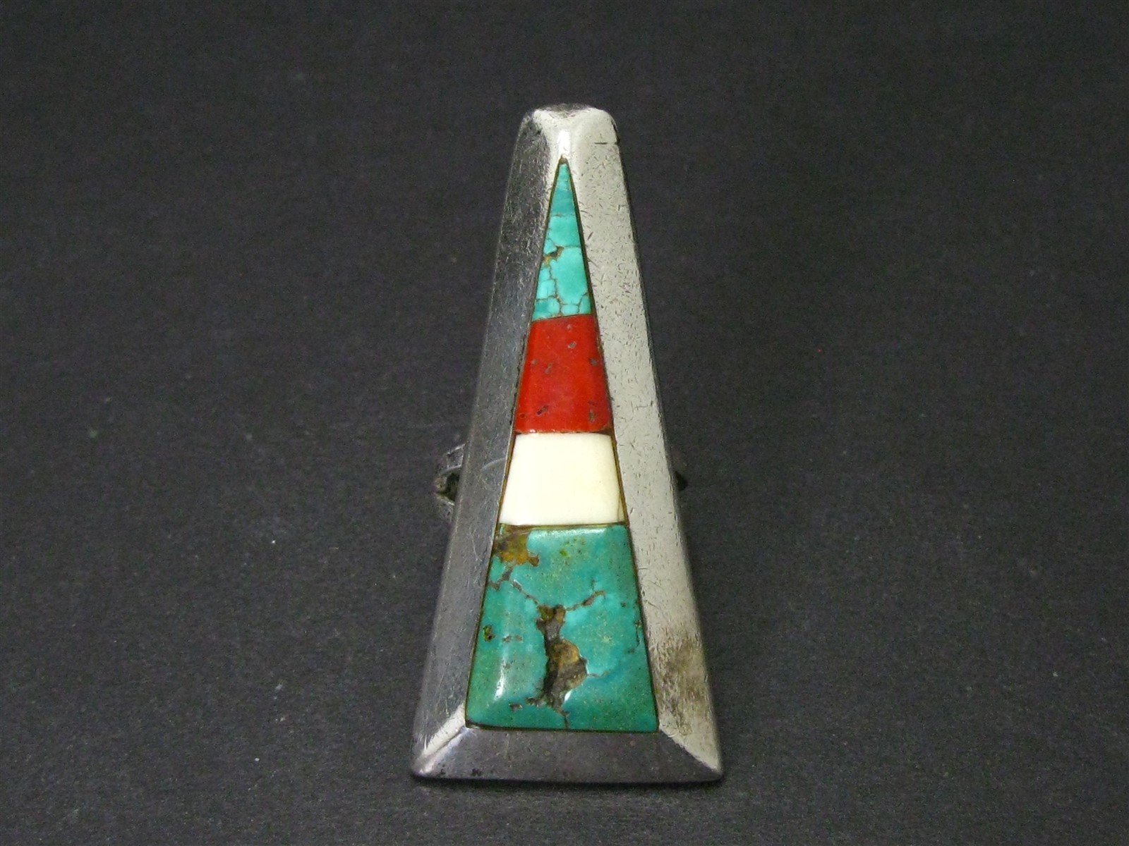 Lovely native american shield ring with turquoise, white agate and coral gems set on the face. signed P.A. Wise tested sterling. 2" tall face.  SIZE-6
