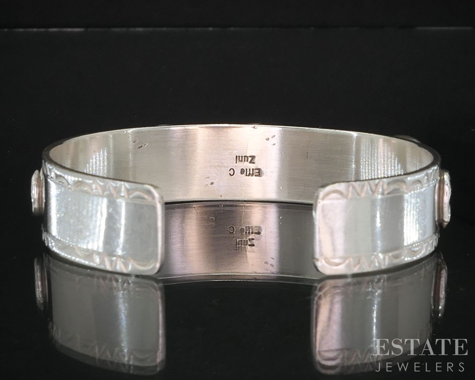 Additional Info: Lovely Zuni Native American cuff bracelet with five natural Turquoise gems bezel set on a snake setting.
