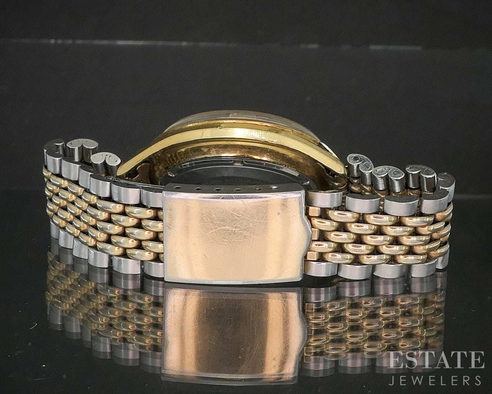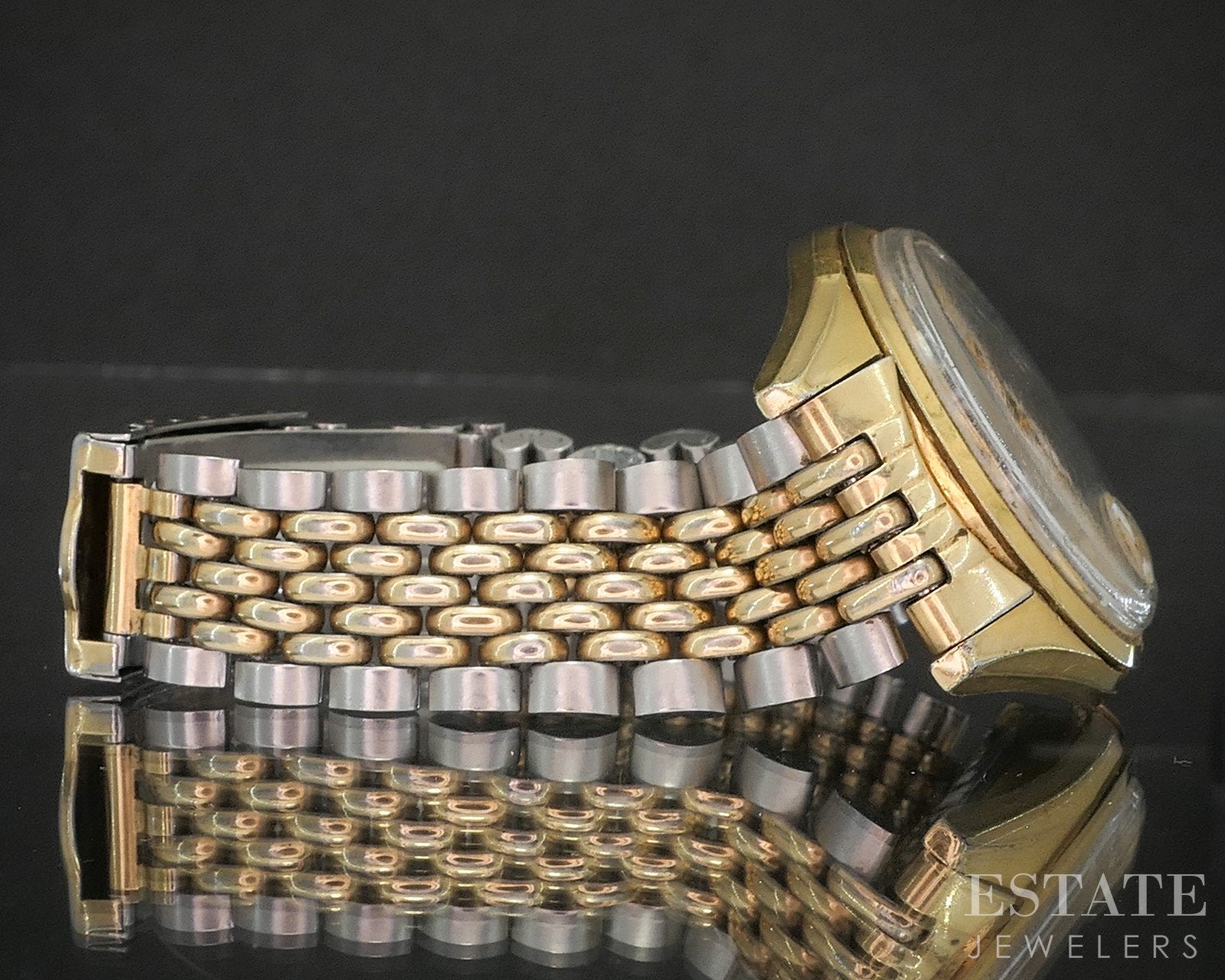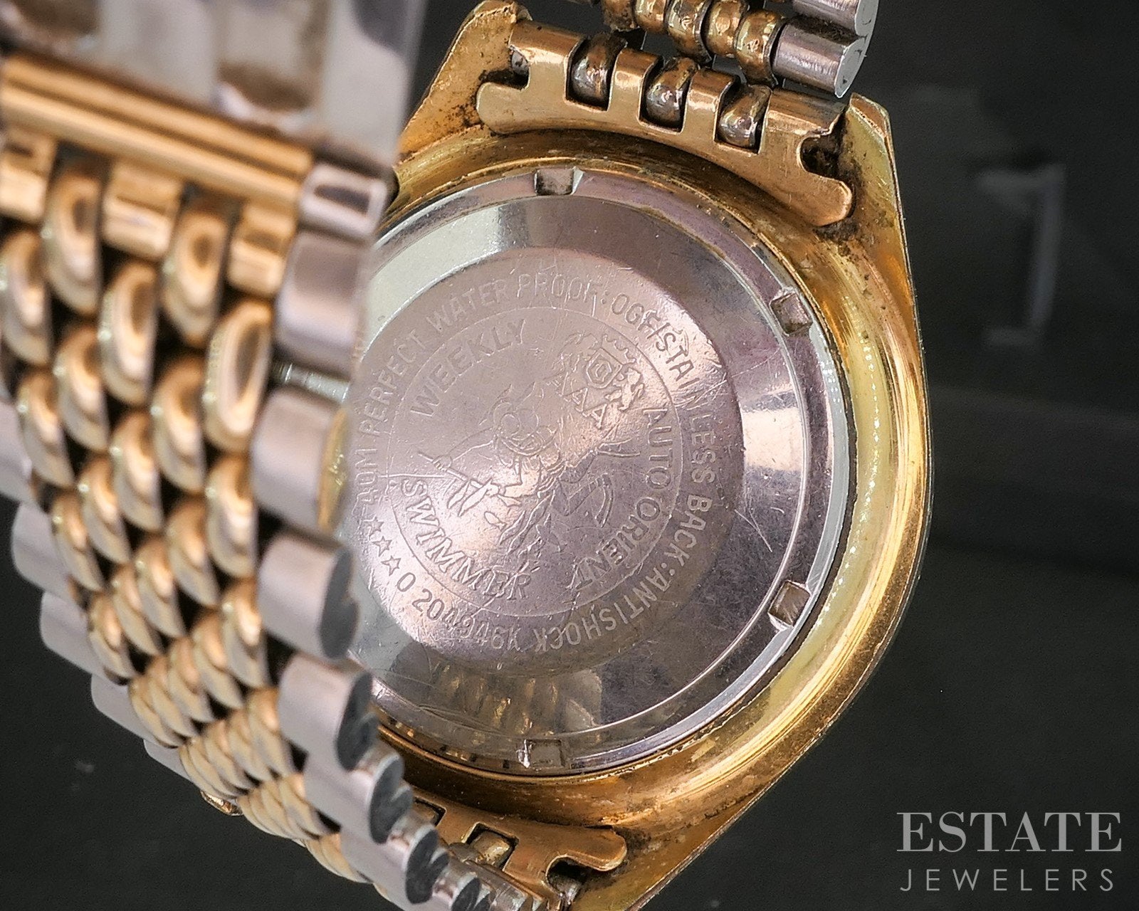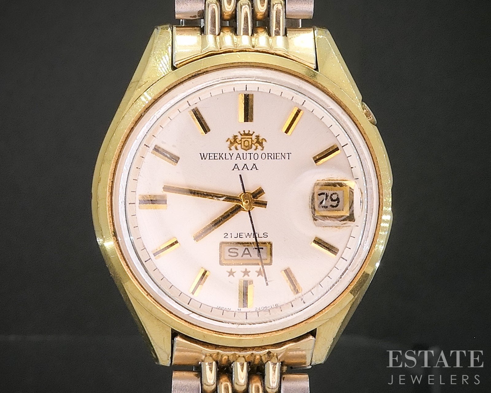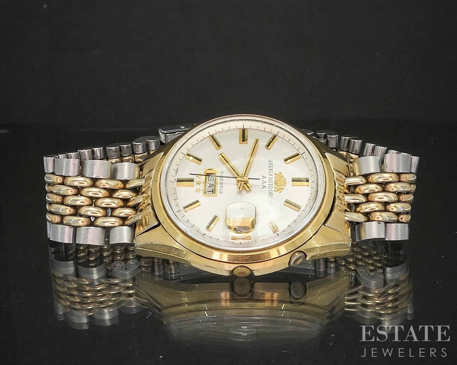 Additional Info: Handsome men's watch from Weekly Orient AAA with a two tone gold filled case and beads of rice bracelet. Stick markers with a day and date window. Automatic watch winds up and runs.